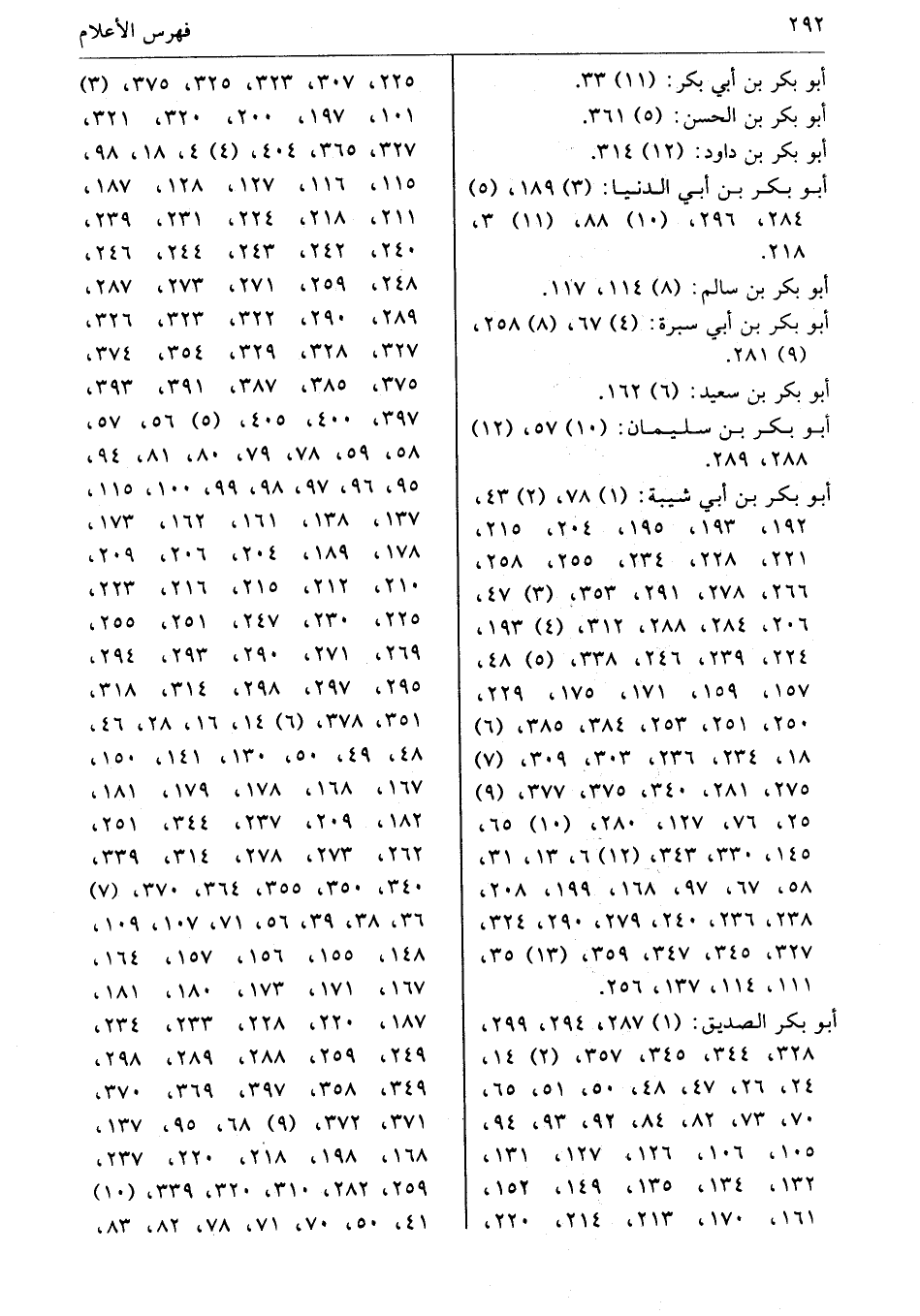 أبو بكر بن أبي شيبة: (1) 78، (2) 43، 192، 193، 195، 204، 215، 221، 228، 234، 255، 258، 266، 278، 291، 353، (3) 47، 206، 284، 288، 312، (4) 193، 224، 239، 246، 338، (5) 48،