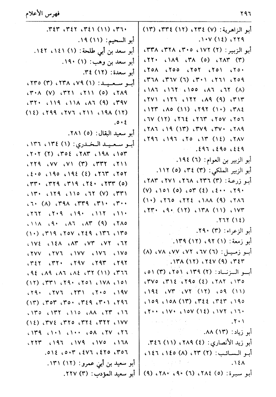 أبو الزناد: (2) 139، 251، (3) 51، 135، 282، (4) 295، 314، 375، (11) 59، (12) 72، 73، 194، 195، 343، 344، (13) 158، 159، 160، 172، (14) 157، 170، 200، 201.