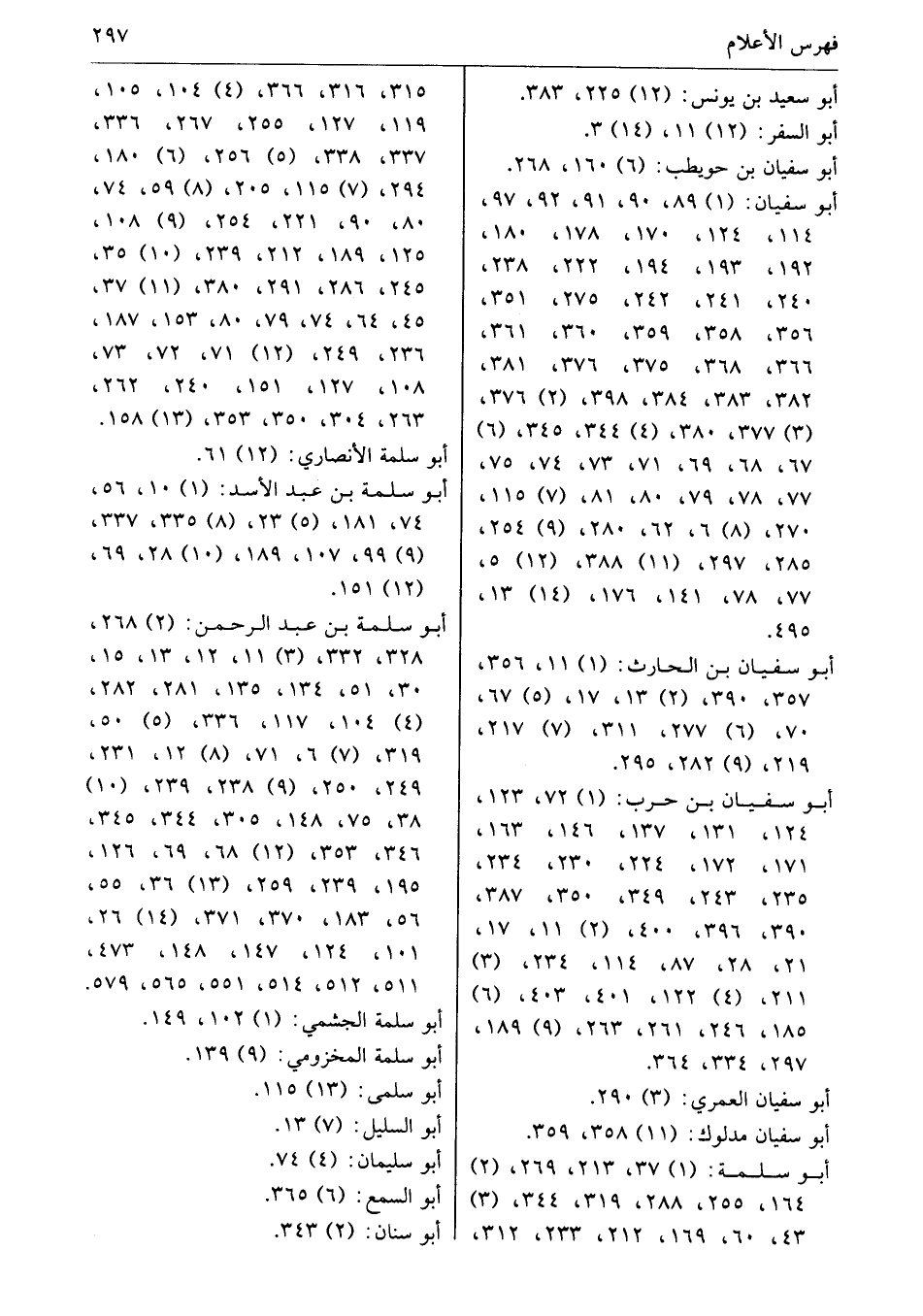 أبو سفيان: (1) 89، 90، 91، 92، 97، 114، 124، 170، 178، 180، 192، 193، 194، 222، 238، 240، 241، 242، 275، 351، 356، 358، 359، 360، 361، 366، 368، 375، 376، 381، 382، 383، 384، 398، (2) 376، (3) 377، 380، (4) 344، 345، (6) 67، 68، 69، 71، 73، 74، 75، 77، 78، 79، 80، 81، (7) 115، 270، (8) 6، 62، 280، (9) 254، 285، 297، (11) 388، (12) 5، 77، 78، 141، 176، (14) 13، 495.