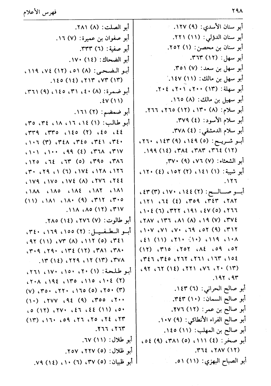 أبو طلحة: (1) 20، 150، 170، 261، (2) 104، 115، 135، 194، 208، (3) 250، (5) 165، 220، 350، (7) 200، 355، (9) 94، 277، (10) 50، (11) 44، 46، 270، (12) 5، 23، 24، 25، 26، 59، 160، (13) 263، 266.