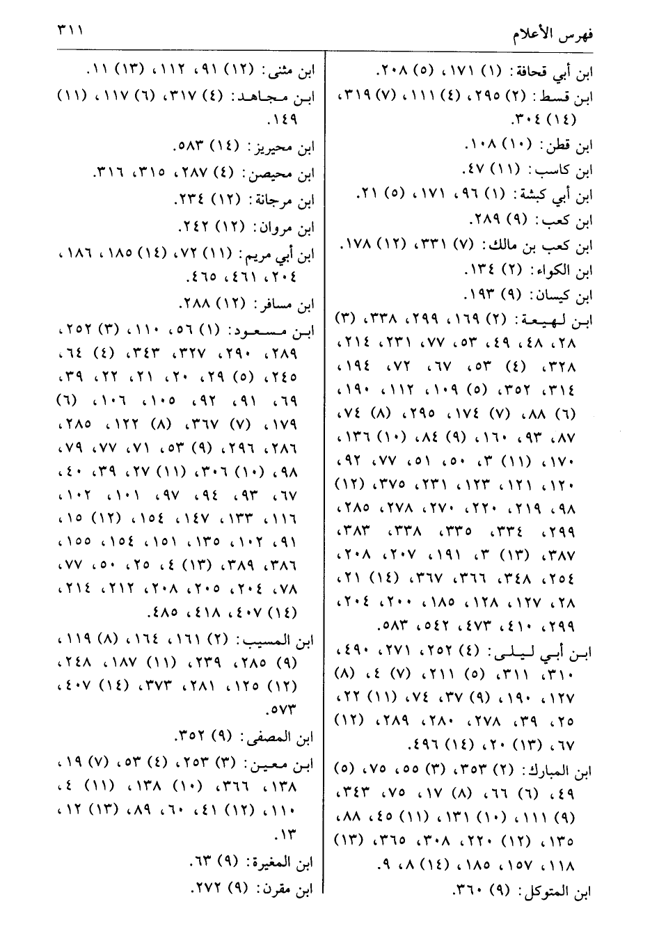 ابن مسعود: (1) 56، 110، (3) 252، 289، 290، 327، 343، (4) 64، 245، (5) 29، 20، 21، 22، 39، 69، 91، 92، 105، 106، (6) 179، (7) 367، (8) 122، 285، 286، 296، (9) 53، 71، 77، 79، 98، (10) 306، (11) 27، 39، 40، 67، 93، 94، 97، 101، 102، 116، 133، 147، 154، (12) 15، 91، 102، 135، 151، 154، 155، 386، 389، (13) 4، 25، 50، 77، 78، 204، 205، 208، 212، 214، (14) 407، 418، 485.