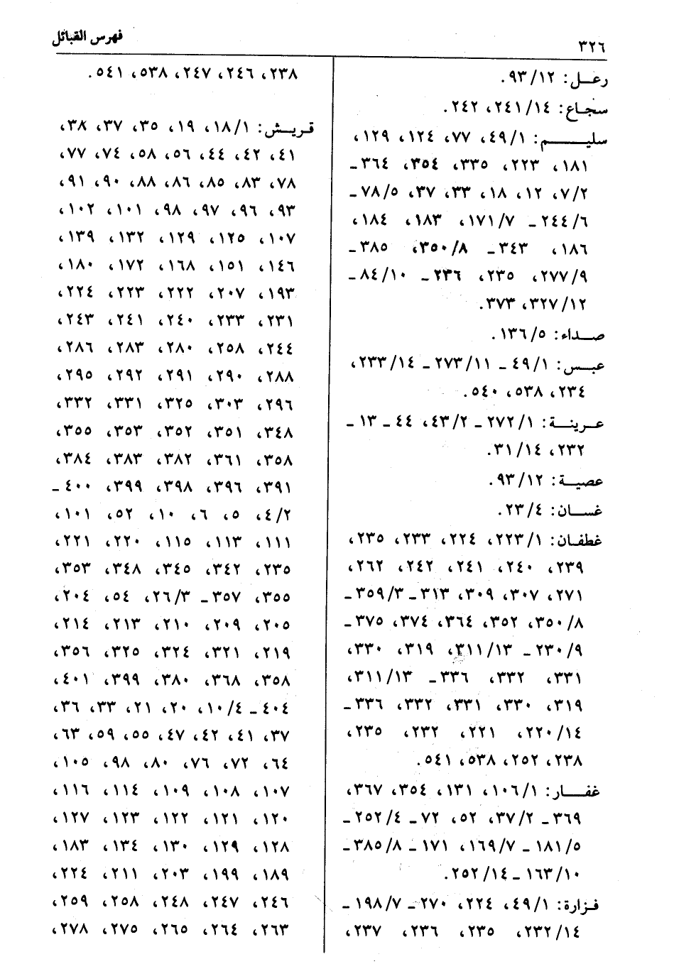 قريش: 1/ 18، 19، 35، 37، 38، 41، 42، 44، 56، 58، 74، 77، 78، 83، 85، 86، 88، 90، 91، 93، 96، 97، 98، 101، 102، 107، 125، 129، 132، 139، 146، 151، 168، 172، 180، 193، 207، 222، 223، 224، 231، 233، 240، 241، 243، 244، 258، 280، 283، 286، 288، 290، 291، 292، 295، 296، 303، 325، 331، 332، 348، 351، 352، 353، 355، 358، 361، 382، 383، 384، 391، 396، 398، 399، 400- 2/ 4، 5، 6، 10، 52، 101، 111، 113، 115، 220، 221، 235، 342، 345، 348، 353، 355، 357- 3/ 26، 54، 204، 205، 209، 210، 213، 214، 219، 321، 324، 325، 356، 358، 368، 380، 399، 401، 404- 4/ 10، 20، 21، 33، 36، 37، 41، 42، 47، 55، 59، 63، 64، 72، 76، 80، 98، 105، 107، 108، 109، 114، 116، 120، 121، 122، 123، 127، 128، 129، 130، 134، 183، 189، 199، 203، 211، 224، 246، 247، 248، 258، 259، 263، 264، 265، 275، 278 ص،