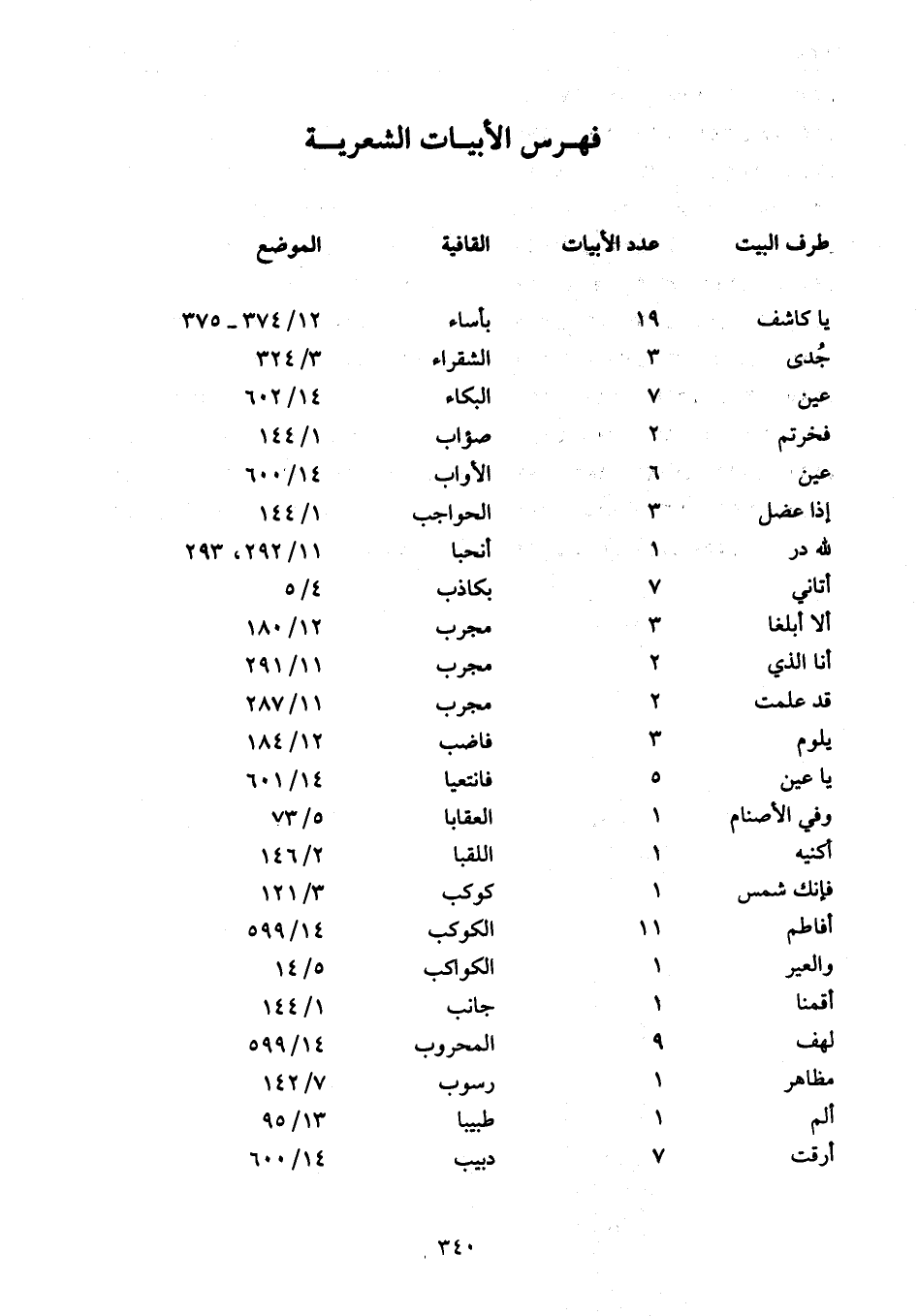 طرف البيت/ عدد الأبيات/ القافية/ الموضع يا كاشف/ 19/ بأساء/ 12/ 374- 375.