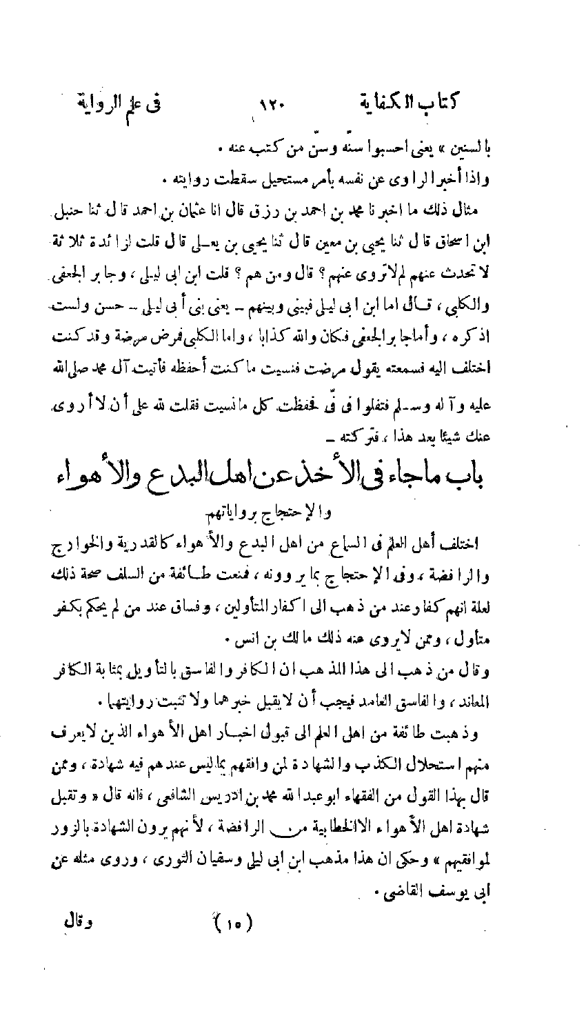 §بَابُ مَا جَاءَ فِي الْأَخْذِ عَنْ أَهْلِ الْبِدَعِ وَالْأَهْوَاءِ وَالِاحْتِجَاجِ بِرِوَايَاتِهِمْ اخْتَلَفَ أَهْلُ الْعِلْمِ فِي السَّمَاعِ مِنْ أَهْلِ الْبِدَعِ وَالْأَهْوَاءِ كَالْقَدَرِيَّةِ وَالْخَوَارِجِ وَالرَّافِضَةِ , وَفِي الِاحْتِجَاجِ بِمَا يَرْوُونَهُ , فَمَنَعَتْ طَائِفَةٌ مِنَ السَّلَفِ صِحَّةَ ذَلِكَ , لِعِلَّةِ أَنَّهُمْ كُفَّارٌ عِنْدَ مَنْ ذَهَبَ إِلَى إِكْفَارِ الْمُتَأَوِّلِينَ , وَفُسَّاقٌ عِنْدَ مَنْ لَمْ يَحْكُمْ بِكُفْرِ مُتَأَوِّلٍ , وَمِمَّنْ لَا يُرْوَى عَنْهُ ذَلِكَ مَالِكُ بْنُ أَنَسٍ , وَقَالَ مَنْ ذَهَبَ إِلَى هَذَا الْمَذْهَبِ: إِنَّ الْكَافِرَ وَالْفَاسِقَ بِالتَّأْوِيلِ بِمَثَابَةِ الْكَافِرِ الْمُعَانِدِ وَالْفَاسِقِ الْعَامِدِ , فَيَجِبُ أَلَّا يُقْبَلَ خَبَرُهُمَا وَلَا تَثْبُتَ رِوَايَتُهُمَا. وَذَهَبَتْ طَائِفَةٌ مِنْ أَهْلِ الْعِلْمِ إِلَى قَبُولِ أَخْبَارِ أَهْلِ الْأَهْوَاءِ , الَّذِينَ لَا يُعْرَفُ مِنْهُمُ اسْتِحْلَالُ الْكَذِبِ وَالشَّهَادَةُ لِمَنْ وَافَقَهُمْ بِمَا لَيْسَ عِنْدَهُمْ فِيهِ شَهَادَةٌ , وَمِمَّنْ قَالَ بِهَذَا الْقَوْلِ مِنَ الْفُقَهَاءِ أَبُو عَبْدِ اللَّهِ مُحَمَّدُ بْنُ إِدْرِيسَ الشَّافِعِيُّ فَإِنَّهُ قَالَ: وَتُقْبَلُ شَهَادَةُ أَهْلِ الْأَهْوَاءِ إِلَّا الْخَطَّابِيَّةَ مِنَ الرَّافِضَةِ , لِأَنَّهُمْ يَرَوْنَ الشَّهَادَةَ بِالزُّورِ لِمُوَافِقِيهِمْ , وَحَكَى أَنَّ هَذَا مَذْهَبَ ابْنِ أَبِي لَيْلَى وَسُفْيَانَ الثَّوْرِيِّ , وَرُوِيَ مِثْلُهُ عَنْ أَبِي يُوسُفَ الْقَاضِي "