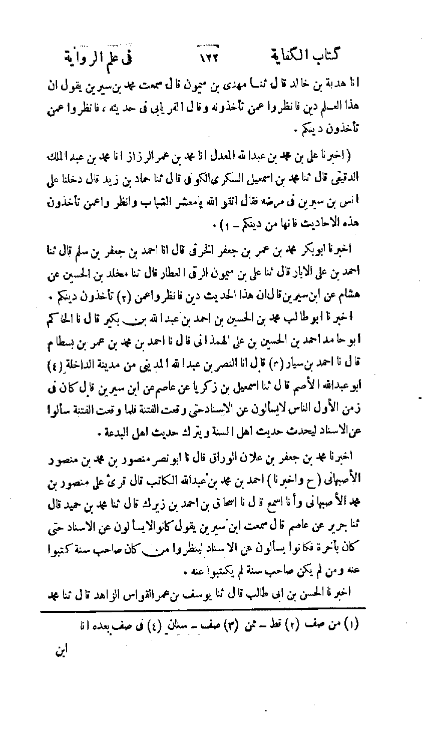 أَخْبَرَنَا مُحَمَّدُ بْنُ جَعْفَرِ بْنِ عَلَّانَ الْوَرَّاقُ، أنا أَبُو نَصْرٍ مَنْصُورُ بْنُ مُحَمَّدِ بْنِ مَنْصُورٍ الْأَصْبَهَانِيُّ , (ح) وَأَخْبَرَنَا أَحْمَدُ بْنُ مُحَمَّدِ بْنِ عَبْدِ اللَّهِ الْكَاتِبُ , قَالَ: قُرِئَ عَلَى مَنْصُورِ بْنِ مُحَمَّدٍ الْأَصْبَهَانِيِّ وَأَنَا أَسْمَعُ، نا إِسْحَاقُ بْنُ أَحْمَدَ بْنِ زَيْرَكٍ، ثنا مُحَمَّدُ بْنُ حُمَيْدٍ، ثنا جَرِيرٌ عَنْ عَاصِمٍ , قَالَ: سَمِعْتُ ابْنَ سِيرِينَ يَقُولُ: §«كَانُوا لَا يَسْأَلُونَ عَنِ الْإِسْنَادِ , حَتَّى كَانَ بِآخِرِهِ , فَكَانُوا يَسْأَلُونَ عَنِ الْإِسْنَادِ , لِيَنْظُرُوا مَنْ كَانَ صَاحِبَ سُنَّةٍ كَتَبُوا عَنْهُ , وَمَنْ لَمْ يَكُنْ صَاحِبَ سُنَّةٍ لَمْ يَكْتُبُوا عَنْهُ»