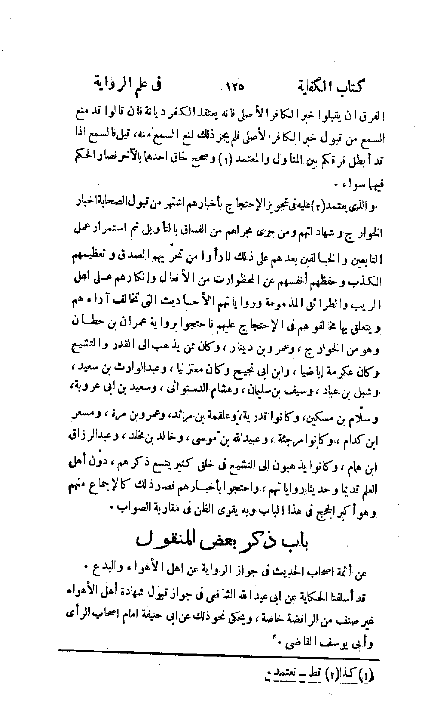 §بَابُ ذِكْرِ بَعْضِ الْمَنْقُولِ عَنْ أَئِمَّةِ أَصْحَابِ الْحَدِيثِ فِي جَوَازِ الرِّوَايَةِ عَنْ أَهْلِ الْأَهْوَاءِ وَالْبِدَعِ قَدْ أَسْلَفْنَا الْحِكَايَةَ عَنْ أَبِي عَبْدِ اللَّهِ الشَّافِعِيِّ فِي جَوَازِ قَبُولِ شَهَادَةِ أَهْلِ الْأَهْوَاءِ , غَيْرَ صِنْفٍ مِنَ الرَّافِضَةِ خَاصَّةً , وَيُحْكَى نَحْوُ ذَلِكَ عَنْ أَبِي حَنِيفَةَ إِمَامِ أَصْحَابِ الرَّأْيِ وَأَبِي يُوسُفَ الْقَاضِي