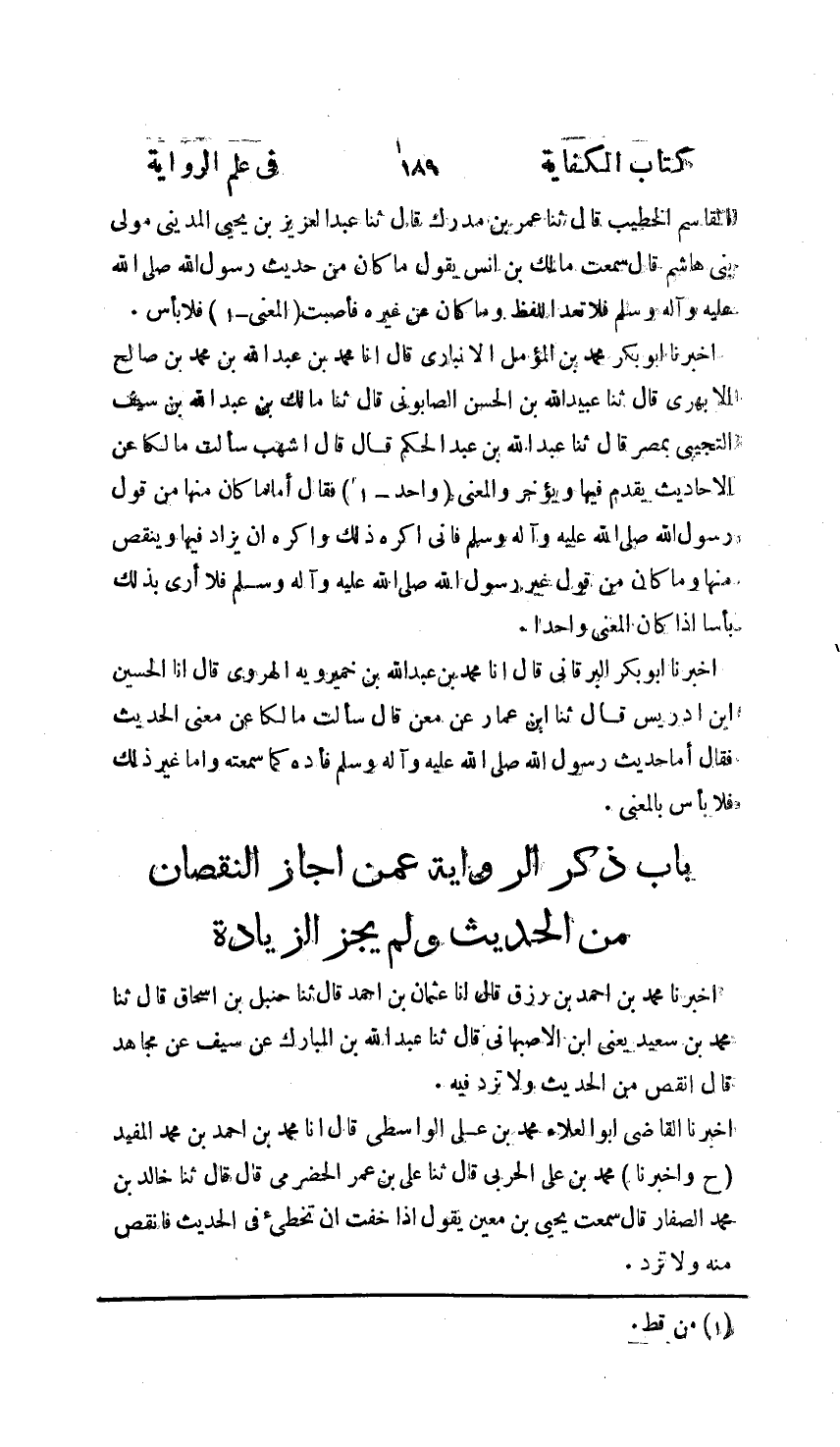 أَخْبَرَنَا الْقَاضِي أَبُو الْعَلَاءِ مُحَمَّدُ بْنُ عَلِيٍّ الْوَاسِطِيُّ، أنا مُحَمَّدُ بْنُ أَحْمَدَ بْنِ مُحَمَّدٍ الْمُفِيدُ , ح وَأَخْبَرَنا مُحَمَّدُ بْنُ عَلِيٍّ الْحَرْبِيُّ، ثنا عَلِيُّ بْنُ عُمَرَ الْحَضْرَمِيُّ قَالَا: ثنا خَالِدُ بْنُ مُحَمَّدٍ الصَّفَّارُ , قَالَ: سَمِعْتُ يَحْيَى بْنَ مَعِينٍ , يَقُولُ: §«إِذَا خِفْتَ أَنْ تُخْطِئَ فِي الْحَدِيثِ فَانْقُصْ مِنْهُ وَلَا تَزِدْ فِيهِ» -[190]- وَمِنَ الْحُجَّةِ لِمَنْ ذَهَبَ إِلَى هَذَا الْمَذْهَبِ قَوْلُ النَّبِيِّ صَلَّى اللهُ عَلَيْهِ وَسَلَّمَ «نَضَّرَ اللَّهُ مَنْ سَمِعَ مَقَالَتِي فَلَمْ يَزِدْ فِيهَا» قَالُوا: وَهَذَا يَدُلُّ عَلَى أَنَّ النُّقْصَانَ مِنْهَا جَائِزٌ , إِذْ لَوْ كَانَ لَمْ يَكُنْ كَذَلِكَ لَذَكَرَهُ كَمَا ذَكَرَ الزِّيَادَةَ