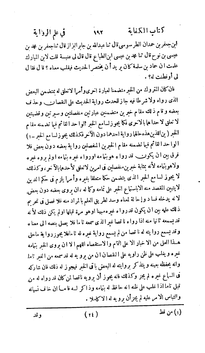 بْنُ جَعْفَرِ بْنِ حَمْدَانَ الطَّرَسُوسِيُّ، ثنا عَبْدُ اللَّهِ بْنُ جَابِرٍ الْبَزَّازُ، ثنا جَعْفَرُ بْنُ مُحَمَّدِ بْنِ عِيسَى بْنِ نُوحٍ، ثنا مُحَمَّدُ بْنُ عِيسَى بْنِ الطَّبَّاعِ , قَالَ: قَالَ لِي عَنْبَسَةُ: قُلْتُ لِابْنِ الْمُبَارَكِ: §عَلِمْتُ أَنَّ حَمَّادَ بْنَ سَلَمَةَ كَانَ يُرِيدُ أَنْ يَخْتَصِرَ الْحَدِيثَ فَيَقْلِبُ مَعْنَاهُ؟ قَالَ: فَقَالَ لِي: أَوَفَطِنْتَ لَهُ " فَأَمَّا إِنْ كَانَ الْمَتْرُوكُ مِنَ الْخَبَرِ مُتَضَمِّنًا لِعِبَارَةٍ أُخْرَى وَأَمْرًا لَا تَعَلُّقَ لَهُ بِمُتَضَمَّنِ الْبَعْضِ الَّذِي رَوَاهُ , وَلَا شَرْطًا فِيهِ , جَازَ لِلْمُحَدِّثِ رِوَايَةُ الْحَدِيثِ عَلَى النُّقْصَانِ , وَحَذْفُ بَعْضِهِ , وَقَامَ ذَلِكَ مَقَامَ خَبَرَيْنِ مُتَضَمَّنَيْنِ عِبَارَتَيْنِ مُنْفَصِلَتَيْنِ وَسِيرَتَيْنِ وَقَضِيَّتَيْنِ , لَا تَعَلُّقَ لِإِحْدَاهُمَا بِالْأُخْرَى , فَكَمَا يَجُوزُ لِسَامِعِ الْخَبَرَيْنِ اللَّذَيْنِ هَذِهِ حَالُهُمَا رِوَايَةُ أَحَدِهِمَا دُونَ الْآخَرِ , فَكَذَلِكَ يَجُوزُ لِسَامِعِ الْخَبَرِ الْوَاحِدِ الْقَائِمِ فِيمَا تَضَمَّنَهُ مَقَامَ الْخَبَرَيْنِ الْمُنْفَصِلَيْنِ رِوَايَةُ بَعْضِهِ دُونَ بَعْضٍ، وَلَا فَرْقَ بَيْنَ أَنْ يَكُونَ قَدْ رَوَاهُ هُوَ بِتَمَامِهِ , أَوْ رَوَاهُ غَيْرُهُ بِتَمَامِهِ , أَوْ لَمْ يَرْوِهِ غَيْرُهُ وَلَا هُوَ بِتَمَامِهِ , لِأَنَّهُ بِمَثَابَةِ خَبَرَيْنِ مُنْفَصِلَيْنِ فِي أَمْرَيْنِ لَا تَعَلُّقَ لِأَحَدِهِمَا بِالْآخَرِ , وَكَذَلِكَ لَا يَجُوزُ لِسَامِعِ الْخَبَرِ الَّذِي يَتَضَمَّنُ حُكْمًا مُتَعَلِّقًا بِغَيْرِهِ , وَأَمْرًا يَلْزَمُ فِي حُكْمِ الدِّينِ , لَا يَتَبَيَّنُ الْمَقْصِدُ مِنْهُ إِلَّا بِاسْتِمَاعِ الْخَبَرِ عَلَى تَمَامِهِ وَكَمَالِهِ , أَنْ يَرْوِيَ بَعْضَهُ دُونَ بَعْضٍ , لِأَنَّهُ يَدْخُلُهُ فَسَادٌ وَإِحَالَةٌ لِمَعْنَاهُ , وَسَدٌّ لِطَرِيقِ الْعِلْمِ بِالْمُرَادِ مِنْهُ , فَلَا فَصْلَ فِي تَحْرِيمِ ذَلِكَ عَلَيْهِ بَيْنَ أَنْ يَكُونَ قَدْ رَوَاهُ غَيْرُهُ مُبَيَّنًا أَوْ هُوَ مَرَّةً قَبْلَهَا , أَوْ لَمْ يَكُنْ ذَلِكَ , لِأَنَّهُ قَدْ يَسْمَعُهُ ثَانِيًا مِنْهُ إِذَا رَوَاهُ نَاقِصًا غَيْرُ الَّذِي سَمِعَهُ تَامًّا , فَلَا يَصِلُ بِنَصِّهِ إِلَى مَعْنَاهُ , وَقَدْ يَسْمَعُ رِوَايَتَهُ لَهُ نَاقِصًا مَنْ لَمْ يَسْمَعْ رِوَايَةَ غَيْرِهِ لَهُ تَامًّا , فَلَا يَجُوزُ رِوَايَةُ مَا حَلَّ هَذَا الْمَحَلَّ مِنَ الْأَخْبَارِ إِلَّا عَلَى التَّمَامِ وَالِاسْتِقْصَاءِ , اللَّهُمَّ إِلَّا أَنْ يَرْوِيَ الْخَبَرَ بِتَمَامِهِ غَيْرُهُ , وَيَغْلِبُ عَلَى ظَنِّ رَاوِيهِ عَلَى النُّقْصَانِ أَنَّ مَنْ يَرْوِيهِ لَهُ قَدْ سَمِعَهُ مِنَ الْغِيَرِ تَامًّا , وَأَنَّهُ يَحْفَظُهُ بِعَيْنِهِ , وَيَتَذَكَّرُ بِرِوَايَتِهِ لَهُ الْبَعْضَ بَاقِيَ الْخَبَرِ , فَيَجُوزُ لَهُ ذَلِكَ , فَإِنْ شَارَكَهُ فِي السَّمَاعِ غَيْرُهُ لَمْ يَجُزْ , وَكَذَلِكَ فَإِنَّهُ يَجُوزُ أَنْ يَرْوِيَهُ نَاقِصًا لِمَنْ كَانَ قَدْ رَوَاهُ لَهُ مِنْ قَبْلُ تَامًّا , إِذَا غَلَبَ عَلَى ظَنِّهِ أَنَّهُ حَافِظٌ لَهُ بِتَمَامِهِ , وَذَاكِرٌ لَهُ , فَأَمَّا إِنْ خَافَ نِسْيَانَهُ وَالْتِبَاسَ الْأَمْرِ عَلَيْهِ , لَمْ يَجُزْ أَنْ يَرْوِيَهُ لَهُ إِلَّا كَامِلًا ,