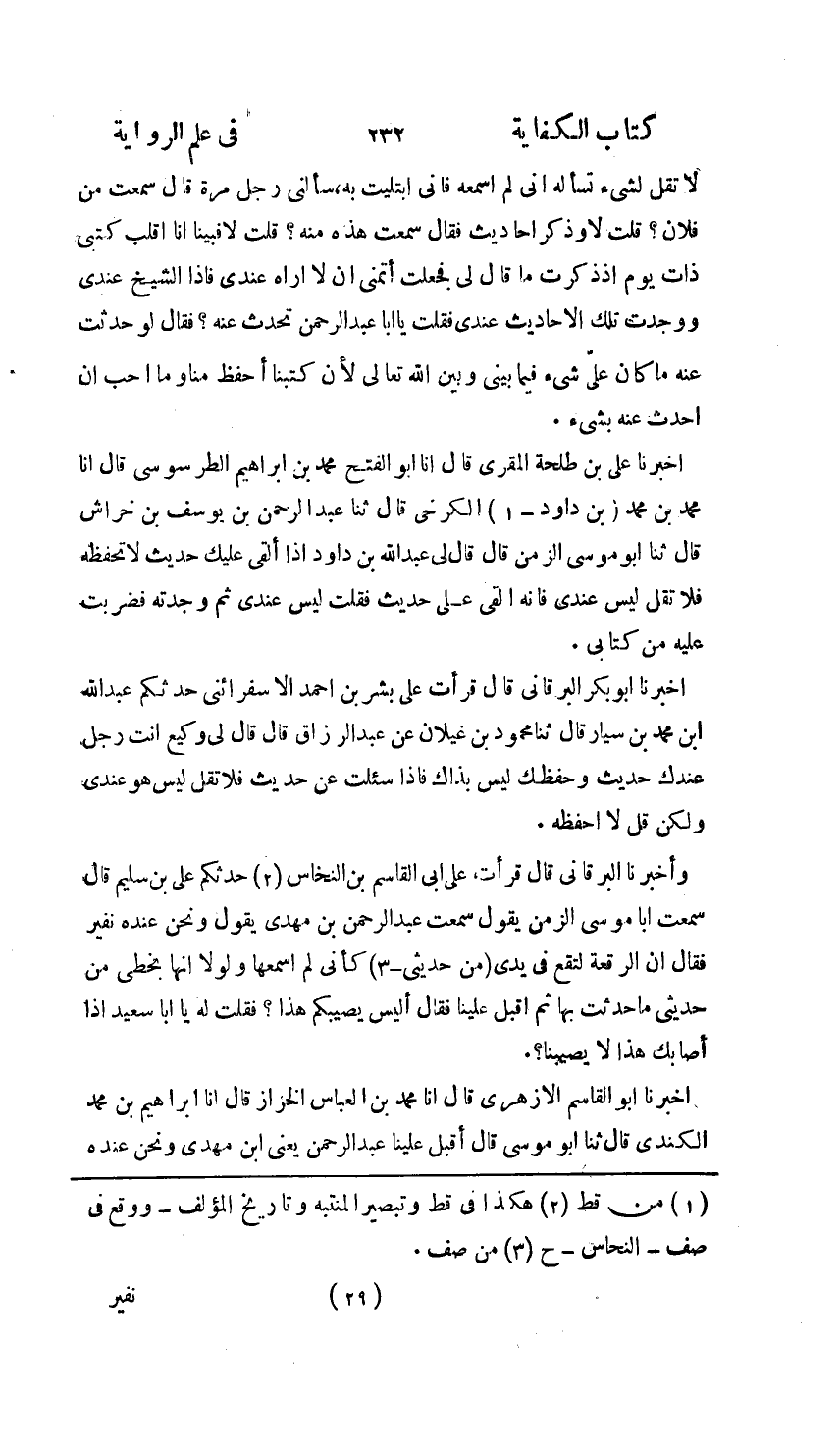 أَخْبَرَنَا أَبُو الْقَاسِمِ الْأَزْهَرِيُّ، أنا مُحَمَّدُ بْنُ الْعَبَّاسِ الْخَزَّازُ، أنا إِبْرَاهِيمُ بْنُ مُحَمَّدٍ الْكِنْدِيُّ، ثنا أَبُو مُوسَى , قَالَ أَقْبَلَ عَلَيْنَا عَبْدُ الرَّحْمَنِ يَعْنِي ابْنَ مَهْدِيٍّ وَنَحْنُ عِنْدَهُ نُفَيْرٌ فَقَالَ: " إِنَّ §الرُّقْعَةَ تَقَعُ فِي يَدِي مِنْ حَدِيثِي وَلَوْلَا أَنَّهَا بِخَطِّي لَمْ أُحَدِّثْ مِنْهَا بِشَيْءٍ، ثُمَّ قَالَ: أَلَيْسَ يُصِيبُكُمْ هَذَا؟ فَقُلْتُ لَهُ: يُصِيبُكَ هَذَا لَا يُصِيبُنَا؟ فَقَالَ: نَعَمْ، لَوْلَا أَنَّهَا بِخَطِّي مَا حَدَّثْتُ بِهَا ". قَالَ: وَمِنْ شَرْطِ صِحَّةِ الرِّوَايَةِ مِنَ الْكِتَابِ أَنْ يَكُونَ سَمَاعُ الرَّاوِي ثَابِتًا وَكِتَابُهُ مُتْقَنًا "