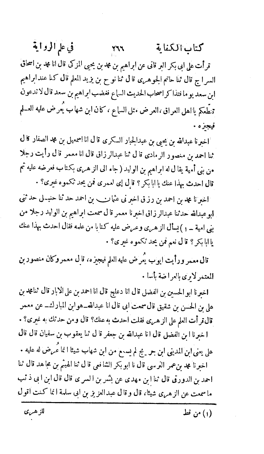 قَرَأْتُ عَلَى أَبِي بَكْرٍ الْبَرْقَانِيِّ , عَنْ إِبْرَاهِيمَ بْنِ مُحَمَّدِ بْنِ يَحْيَى الْمُزَكِّي، أنا مُحَمَّدُ بْنُ إِسْحَاقَ السَّرَّاجُ، ثنا حَاتِمٌ الْجَوْهَرِيُّ، ثنا نُوحُ بْنُ يَزِيدَ الْمُعَلِّمُ , قَالَ: كُنَّا عِنْدَ إِبْرَاهِيمَ بْنِ سَعْدٍ يَوْمًا , فَتَذَاكَرَ أَصْحَابُ الْحَدِيثِ السَّمَاعَ , فَغَضِبَ إِبْرَاهِيمُ بْنُ سَعْدٍ , وَقَالَ: لَا تَدَعُونَ تَنَطُّعَكُمْ يَا أَهْلَ الْعِرَاقِ: §«الْعَرْضُ مِثْلُ السَّمَاعِ كَانَ ابْنُ شِهَابٍ يُعْرَضُ عَلَيْهِ الْعِلْمُ فَيُجِيزُهُ»