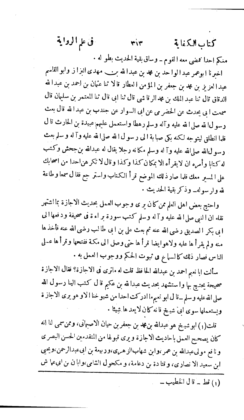 أَخْبَرَنَا أَبُو عُمَرَ عَبْدُ الْوَاحِدِ بْنُ مُحَمَّدِ بْنِ عَبْدِ اللَّهِ بْنِ مَهْدِيٍّ الْبَزَّازُ , وَأَبُو الْقَاسِمِ عَبْدُ الْعَزِيزِ بْنُ مُحَمَّدِ بْنِ جَعْفَرِ بْنِ الْمُؤْمِنِ الْعَطَّارُ , قَالَا: ثنا عُثْمَانُ بْنُ أَحْمَدَ بْنِ عَبْدِ اللَّهِ الدَّقَّاقُ، ثنا عَبْدُ الْمَلِكِ بْنُ مُحَمَّدٍ الرَّقَاشِيُّ، ثنا أَبِي، ثنا الْمُعْتَمِرُ بْنُ سُلَيْمَانَ , قَالَ: سَمِعْتُ أَبِي يُحَدِّثُ عَنِ الْحَضْرَمِيِّ , عَنْ أَبِي السَّوَّارِ , عَنْ جُنْدُبِ بْنِ عَبْدِ اللَّهِ , قَالَ: بَعَثَ رَسُولُ اللَّهِ صَلَّى اللهُ عَلَيْهِ وَسَلَّمَ رَهْطًا وَاسْتَعْمَلَ عَلَيْهِمْ عُبَيْدَةَ بْنَ الْحَارِثِ , قَالَ: فَلَمَّا انْطَلَقَ لِيَتَوَجَّهَ لَكِنَّهُ بَكَى صَبَابَةً إِلَى رَسُولِ اللَّهِ صَلَّى اللهُ عَلَيْهِ وَسَلَّمَ , بَعَثَ رَسُولُ اللَّهِ صَلَّى اللهُ عَلَيْهِ وَسَلَّمَ مَكَانَهُ رَجُلًا يُقَالُ لَهُ عَبْدُ اللَّهِ بْنُ جَحْشٍ , وَكَتَبَ لَهُ كِتَابًا , وَأَمَرَهُ أَلَّا يَقْرَأَهُ إِلَّا بِمَكَانِ كَذَا وَكَذَا , وَقَالَ: §«لَا تُكْرِهَنَّ أَحَدًا مِنْ أَصْحَابِكَ عَلَى السَّيْرِ مَعَكَ» فَلَمَّا صَارَ فِي ذَلِكَ الْمَوْضِعِ قَرَأَ الْكِتَابَ وَاسْتَرْجَعَ , فَقَالَ: سَمْعًا وَطَاعَةً لِلَّهِ وَلِرَسُولِهِ - وَذَكَرَ بَقِيَّةَ الْحَدِيثِ " وَاحْتَجَّ بَعْضُ أَهْلِ الْعِلْمِ , مِمَّنْ كَانَ يَرَى وُجُوبَ الْعَمَلِ بِحَدِيثِ الْإِجَازَةِ بِمَا اشْتُهِرَ نَقْلُهُ أَنَّ النَّبِيَّ صَلَّى اللهُ عَلَيْهِ وَسَلَّمَ كَتَبَ سُورَةَ بَرَاءَةَ فِي صَحِيفَةٍ وَدَفَعَهَا إِلَى أَبِي بَكْرٍ الصِّدِّيقِ رَضِيَ اللَّهُ عَنْهُ , ثُمَّ بَعَثَ عَلِيَّ بْنَ أَبِي طَالِبٍ رَضِيَ اللَّهُ عَنْهُ فَأَخَذَهَا مِنْهُ , وَلَمْ يَقْرَأْهَا عَلَيْهِ وَلَا هُوَ أَيْضًا قَرَأَهَا حَتَّى وَصَلَ إِلَى مَكَّةَ فَفَتَحَهَا وَقَرَأَهَا عَلَى النَّاسِ , فَصَارَ ذَلِكَ كَالسَّمَاعِ فِي ثُبُوتِ الْحُكْمِ وَوُجُوبِ الْعَمَلِ بِهِ. سَأَلْتُ أَبَا نُعَيْمٍ أَحْمَدَ بْنَ عَبْدِ اللَّهِ الْحَافِظَ قُلْتُ لَهُ: مَا تَرَى فِي الْإِجَازَةِ؟ فَقَالَ: الْإِجَازَةُ صَحِيحَةٌ يُحْتَجُّ بِهَا , وَاسْتَشْهَدَ بِحَدِيثِ عَبْدِ اللَّهِ بْنِ عُكَيْمٍ قَالَ: كَتَبَ إِلَيْنَا رَسُولُ اللَّهِ صَلَّى اللَّهُ عَلَيْهِ وَسَلَّمَّ - وَقَالَ أَبُو نُعَيْمٍ: مَا أَدْرَكْتُ أَحَدًا مِنْ شُيُوخِنَا إِلَّا وَهُوَ يَرَى الْإِجَازَةَ وَيَسْتَعْمِلُهَا , سِوَى أَبِي شَيْخٍ فَإِنَّهُ كَانَ لَا يَعُدُّهَا شَيْئًا , قَالَ الْخَطِيبُ: أَبُو شَيْخٍ هُوَ عَبْدُ اللَّهِ بْنُ مُحَمَّدِ بْنِ جَعْفَرِ بْنِ حَيَّانَ الْأَصْبَهَانِيُّ , وَمِمَّنْ سُمِّيَ لَنَا أَنَّهُ كَانَ يُصَحِّحُ الْعَمَلَ بِأَحَادِيثِ الْإِجَازَةِ وَيَرَى قَبُولَهَا مِنَ الْمُتَقَدِّمِينَ الْحَسَنُ الْبَصْرِيُّ , وَنَافِعٌ مَوْلَى عَبْدِ اللَّهِ بْنِ عُمَرَ , وَابْنُ شِهَابٍ الزُّهْرِيُّ , وَرَبِيعَةُ بْنُ أَبِي عَبْدِ الرَّحْمَنِ , وَيَحْيَى بْنُ سَعِيدٍ الْأَنْصَارِيُّ , وَقَتَادَةُ بْنُ دِعَامَةَ , وَمَكْحُولٌ الشَّامِيُّ , وَأَبَانُ بْنُ أَبِي عَيَّاشٍ , -[314]- وَأَيُّوبُ السِّخْتِيَانِيُّ , وَعُبَيْدُ اللَّهِ بْنُ عُمَرَ بْنِ حَفْصٍ , وَهِشَامُ بْنُ عُرْوَةَ , وَيَحْيَى بْنُ أَبِي كَثِيرٍ , وَمَنْصُورُ بْنُ الْمُعْتَمِرِ , وَعُبَيْدُ اللَّهِ بْنُ أَبِي جَعْفَرٍ , وَحَيْوَةُ بْنُ شُرَيْحٍ , وَشُعَيْبُ بْنُ أَبِي حَمْزَةَ وَأَبُو عَمْرٍو الْأَوْزَاعِيُّ , وَابْنُ أَبِي ذِئْبٍ , وَمَالِكُ بْنُ أَنَسٍ , وَعَبْدُ الْعَزِيزِ بْنُ الْمَاجِشُونِ , وَعَبْدُ الْمَلِكِ بْنُ جُرَيْجٍ , وَسُفْيَانُ الثَّوْرِيُّ , وَاللَّيْثُ بْنُ سَعْدٍ , وَمُعَاوِيَةُ بْنُ سَلَّامٍ , وَسُفْيَانُ بْنُ عُيَيْن