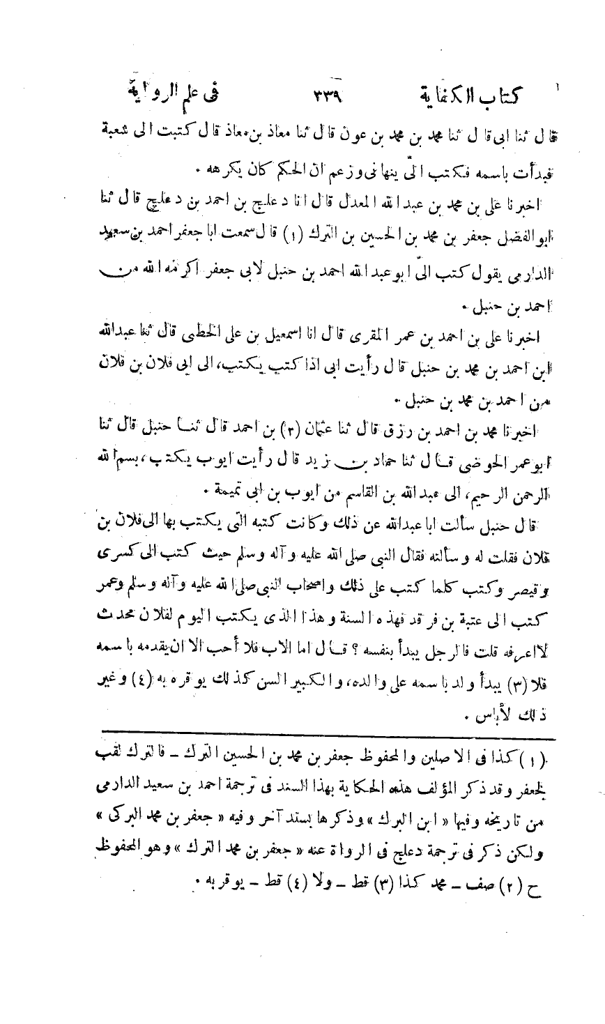 أَخْبَرَنَا مُحَمَّدُ بْنُ أَحْمَدَ بْنِ رِزْقٍ، أَخْبَرَنَا عُثْمَانُ بْنُ أَحْمَدَ، ثنا حَنْبَلٌ، ثنا أَبُو عُمَرَ الْحَوْضِيُّ، ثنا حَمَّادُ بْنُ زَيْدٍ , قَالَ: " §رَأَيْتُ أَيُّوبَ كَتَبَ: بِسْمِ اللَّهِ الرَّحْمَنِ الرَّحِيمِ إِلَى عَبْدِ اللَّهِ بْنِ الْقَاسِمِ مِنْ أَيُّوبَ بْنِ أَبِي تَمِيمَةَ " قَالَ حَنْبَلٌ: سَأَلْتُ أَبَا عَبْدِ اللَّهِ عَنْ ذَلِكَ , وَكَانَتْ كُتُبُهُ الَّتِي يَكْتُبُ بِهَا إِلَى فُلَانِ بْنِ فُلَانٍ , فَقُلْتُ لَهُ وَسَأَلْتُهُ , فَقَالَ: النَّبِيُّ صَلَّى اللهُ عَلَيْهِ وَسَلَّمَ حَيْثُ كَتَبَ إِلَى كِسْرَى , وَقَيْصَرَ , وَكَتَبَ كُلَّ مَا كَتَبَ عَلَى ذَلِكَ وَأَصْحَابُ النَّبِيِّ صَلَّى اللهُ عَلَيْهِ وَسَلَّمَ وَعُمَرُ كَتَبَ إِلَى عُتْبَةَ بْنِ فَرْقَدٍ , فَهَذِهِ السُّنَّةُ , وَهَذَا الَّذِي يُكْتَبُ الْيَوْمَ لِفُلَانٍ مُحْدَثُ لَا أَعْرِفُهُ , قُلْتُ: فَالرَّجُلُ يَبْدَأُ بِنَفْسِهِ؟ قَالَ: أَمَّا الْأَبُ فَلَا أُحِبُّ إِلَّا أَنْ يُقَدِّمَهُ بِاسْمِهِ , وَلَا يَبْدَأُ وَلَدٌ بِاسْمِهِ عَلَى وَالِدِهِ، وَالْكَبِيرُ السِّنِّ كَذَلِكَ يُوَقَّرُ بِهِ , وَغَيْرُ ذَلِكَ لَا بَأْسَ