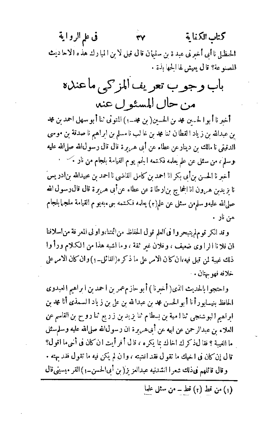 أَخْبَرَنَا الْحَسَنُ بْنُ أَبِي بَكْرٍ , أنا أَحْمَدُ بْنُ كَامِلٍ الْقَاضِي , أنا أَحْمَدُ بْنُ عُبَيْدِ اللَّهِ بْنِ إِدْرِيسَ , نا يَزِيدُ بْنُ هَارُونَ , أنا الْحَجَّاجُ بْنُ أَرْطَاةَ , عَنْ عَطَاءٍ , عَنْ أَبِي هُرَيْرَةَ , قَالَ: قَالَ رَسُولُ اللَّهِ صَلَّى اللَّهُ عَلَيْهِ وَسَلَّمَّ: §«مَنْ سُئِلَ عِلْمًا يَعْلَمُهُ فَكَتَمَهُ جِيءَ بِهِ يَوْمَ الْقِيَامَةِ مُلْجَمًا بِلِجَامٍ مِنْ نَارٍ» وَقَدْ أَنْكَرَ قَوْمٌ لَمْ يَتَبَحَّرُوا فِي الْعِلْمِ قَوْلَ الْحُفَّاظِ مِنْ أَئِمَّتِنَا وَأُولِي الْمَعْرِفَةِ مِنْ أَسْلَافِنَا: إِنَّ فُلَانًا الرَّاوِيَ ضَعِيفٌ , وَفُلَانٌ غَيْرُ ثِقَةٍ , وَمَا أَشْبَهَ هَذَا مِنَ الْكَلَامِ , وَرَأَوْا ذَلِكَ غِيبَةً لِمَنْ قِيلَ فِيهِ , إِنْ كَانَ الْأَمْرُ عَلَى مَا ذَكَرَهُ الْقَائِلُ , وَإِنْ كَانَ الْأَمْرُ عَلَى خِلَافِهِ فَهُوَ بُهْتَانٌ. وَاحْتَجُّوا بِالْحَدِيثِ الَّذِي