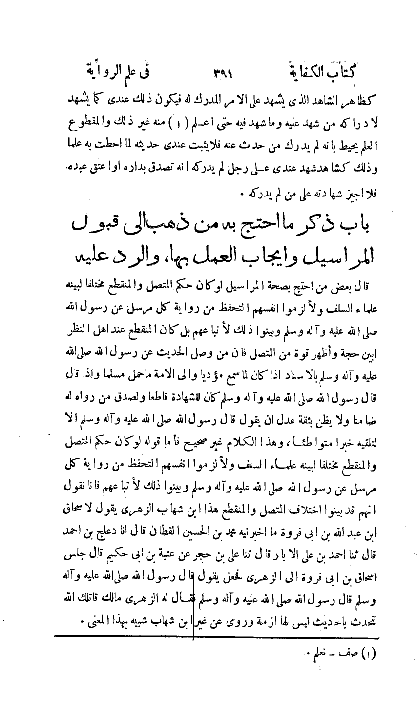 §بَابُ ذِكْرِ مَا احْتَجَّ بِهِ مَنْ ذَهَبَ إِلَى قَبُولِ الْمَرَاسِيلِ وَإِيجَابِ الْعَمَلِ بِهَا وَالرَّدِ عَلَيْهِ قَالَ بَعْضُ مَنِ احْتَجَّ بِصِحَّةِ الْمَرَاسِيلِ: لَوْ كَانَ حُكْمُ الْمُتَّصِلِ وَالْمُنْقَطِعِ مُخْتَلِفًا لَبَيَّنَهُ عُلَمَاءُ السَّلَفِ , وَلَأَلْزَمُوا أَنْفُسَهُمُ التَّحَفُّظَ مِنْ رِوَايَةِ كُلِّ مُرْسَلٍ عَنْ رَسُولِ اللَّهِ صَلَّى اللهُ عَلَيْهِ وَسَلَّمَ، وَسَنُّوا ذَلِكَ لِأَتْبَاعِهِمْ , بَلْ كَانَ الْمُنْقَطِعُ عِنْدَ أَهْلِ النَّظَرِ أَبْيَنَ حُجَّةً وَأَظْهَرَ قُوَّةً مِنَ الْمُتَّصِلِ؛ لِأَنَّ مَنْ وَصَلَ الْحَدِيثَ عَنْ رَسُولِ اللَّهِ صَلَّى اللهُ عَلَيْهِ وَسَلَّمَ بِالْإِسْنَادِ , إِذَا كَانَ لِمَا سَمِعَ مُؤَدِّيًا , وَإِلَى الْأُمَّةِ مَا حَمَلَ مُسَلِّمًا , وَإِذَا قَالَ: قَالَ رَسُولُ اللَّهِ صَلَّى اللهُ عَلَيْهِ وَسَلَّمَ , كَانَ لِلشَّهَادَةِ قَاطِعًا , وَلِصِدْقِ مَنْ رَوَاهُ لَهُ ضَامِنًا , وَلَا يُظَنُّ بِثِقَةٍ عَدْلٍ أَنْ يَقُولَ: قَالَ رَسُولُ اللَّهِ صَلَّى اللهُ عَلَيْهِ وَسَلَّمَ إِلَّا لِتَلَقِّيهِ خَبَرًا مُتَوَاطِئًا , وَهَذَا الْكَلَامُ غَيْرُ صَحِيحٍ , فَأَمَّا قَوْلُهُ: لَوْ كَانَ حُكْمُ الْمُتَّصِلِ وَالْمُنْقَطِعِ مُخْتَلِفًا لَبَيَّنَهُ عُلَمَاءُ السَّلَفِ , وَلَأَلْزَمُوا أَنْفُسَهُمُ التَّحَفُّظَ مِنْ رِوَايَةِ كُلِّ مُرْسَلٍ عَنْ رَسُولِ اللَّهِ صَلَّى اللهُ عَلَيْهِ وَسَلَّمَ , وَبَيَّنُوا ذَلِكَ لِأَتْبَاعِهِمْ , فَإِنَّا نَقُولُ: إِنَّهُمْ قَدْ بَيَّنُوا اخْتِلَافَ الْمُتَّصِلِ وَالْمُنْقَطِعِ , هَذَا ابْنُ شِهَابٍ الزُّهْرِيُّ يَقُولُ لِإِسْحَاقَ بْنِ عَبْدِ اللَّهِ بْنِ أَبِي فَرْوَةَ