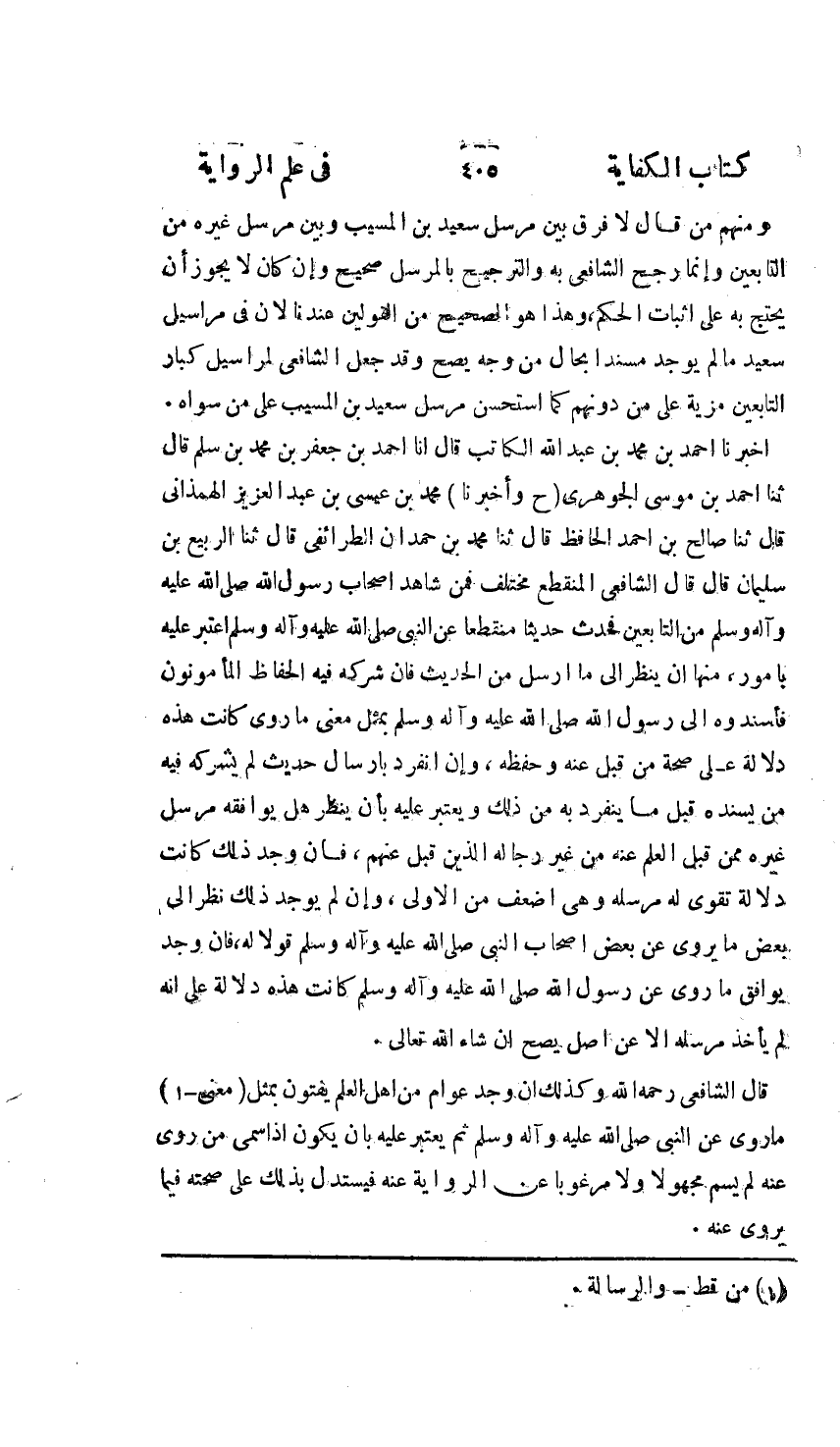 أَخْبَرَنَا أَحْمَدُ بْنُ مُحَمَّدِ بْنِ عَبْدِ اللَّهِ الْكَاتِبُ، أنا أَحْمَدُ بْنُ جَعْفَرِ بْنِ مُحَمَّدِ بْنِ سَلْمٍ، ثنا أَحْمَدُ بْنُ مُوسَى الْجَوْهَرِيُّ , ح وَأَخْبَرَنا مُحَمَّدُ بْنُ عِيسَى بْنِ عَبْدِ الْعَزِيزِ الْهَمَذَانِيُّ، ثنا صَالِحُ بْنُ أَحْمَدَ الْحَافِظُ، ثنا مُحَمَّدُ بْنُ حَمْدَانَ الطَّرَائِفِيُّ قَالَا: ثنا الرَّبِيعُ بْنُ سُلَيْمَانَ , قَالَ: قَالَ الشَّافِعِيُّ: §" الْمُنْقَطِعُ مُخْتَلِفٌ , فَمَنْ شَاهَدَ أَصْحَابَ رَسُولِ اللَّهِ صَلَّى اللهُ عَلَيْهِ وَسَلَّمَ مِنَ التَّابِعِينَ , فَحَدَّثَ حَدِيثًا مُنْقَطِعًا عَنِ النَّبِيِّ صَلَّى اللهُ عَلَيْهِ وَسَلَّمَ , اعْتُبِرَ عَلَيْهِ بِأُمُورٍ , مِنْهَا أَنْ يُنْظَرَ إِلَى مَا أَرْسَلَ مِنَ الْحَدِيثِ , فَإِنْ شَرَكَهُ فِيهِ الْحُفَّاظُ الْمَأْمُونُونَ , فَأَسْنَدُوهُ إِلَى رَسُولِ اللَّهِ صَلَّى اللهُ عَلَيْهِ وَسَلَّمَ بِمِثْلِ مَعْنَى مَا رَوَى , كَانَتْ هَذِهِ دِلَالَةً عَلَى صِحَّةِ مَنْ قُبِلَ عَنْهُ وَحِفْظِهِ , وَإِنِ انْفَرَدَ بِإِرْسَالِ حَدِيثٍ لَمْ يَشْرِكْهُ فِيهِ مَنْ يُسْنِدُهُ , قُبِلَ مَا يَنْفَرِدُ بِهِ مِنْ ذَلِكَ , وَيُعْتَبَرُ عَلَيْهِ بِأَنْ يُنْظَرَ: هَلْ يُوَافِقُهُ مُرْسِلٌ غَيْرُهُ مِمَّنْ قُبِلَ الْعِلْمُ عَنْهُ مِنْ غَيْرِ رِجَالِهِ الَّذِينَ قُبِلَ عَنْهُمْ , فَإِنْ وُجِدَ ذَلِكَ كَانَتْ دِلَالَةً تُقَوِّي لَهُ مُرْسَلَهُ , وَهِيَ أَضْعَفُ مِنَ الْأُولَى , وَإِنْ لَمْ يُوجَدْ ذَلِكَ نُظِرَ إِلَى بَعْضِ مَا يُرْوَى عَنْ بَعْضِ أَصْحَابِ النَّبِيِّ صَلَّى اللهُ عَلَيْهِ وَسَلَّمَ قَوْلًا لَهُ , فَإِنْ وُجِدَ يُوَافِقُ مَا رَوَى عَنْ رَسُولِ اللَّهِ صَلَّى اللهُ عَلَيْهِ وَسَلَّمَ كَانَتْ هَذِهِ دِلَالَةً عَلَى أَنَّهُ لَمْ يَأْخُذْ مُرْسَلَهُ إِلَّا عَنْ أَصْلٍ يَصِحُّ إِنْ شَاءَ اللَّهُ "