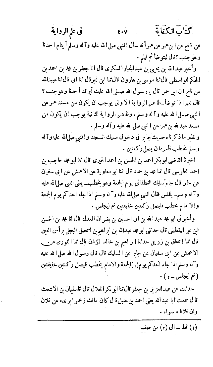 أَخْبَرَنَا عَبْدُ اللَّهِ بْنُ يَحْيَى بْنِ عَبْدِ الْجَبَّارِ السُّكَّرِيُّ، أنا جَعْفَرُ بْنُ مُحَمَّدِ بْنِ أَحْمَدَ بْنِ الْحَكَمِ الْوَاسِطِيُّ، ثنا مُوسَى بْنُ هَارُونَ، ثنا ابْنُ نُمَيْرٍ، ثنا أَبِي، ثنا عُبَيْدُ اللَّهِ , عَنْ نَافِعٍ , عَنِ ابْنِ عُمَرَ، أَنَّ عُمَرَ قَالَ: يَا رَسُولَ اللَّهِ، أَيَرْقُدُ أَحَدُنَا وَهُوَ جُنُبٌ قَالَ: §«نَعَمْ إِذَا تَوَضَّأَ» ظَاهِرُ الرِّوَايَةِ الْأُولَى يُوجِبُ أَنْ تَكُونَ مِنْ مُسْنَدِ عُمَرَ عَنِ النَّبِيِّ صَلَّى اللهُ عَلَيْهِ وَسَلَّمَ , وَالثَّانِيَةِ ظَاهِرُهَا يُوجِبُ أَنْ يَكُونَ مِنْ مُسْنَدِ عَبْدِ اللَّهِ بْنِ عُمَرَ عَنِ النَّبِيِّ صَلَّى اللهُ عَلَيْهِ وَسَلَّمَ , وَنَظِيرُ مَا ذَكَرْنَاهُ حَدِيثُ جَابِرٍ فِي دُخُولِ سُلَيْكٍ الْمَسْجِدَ وَالنَّبِيُّ صَلَّى اللهُ عَلَيْهِ وَسَلَّمَ يَخْطُبُ , فَأَمَرَهُ أَنْ يُصَلِّيَ رَكْعَتَيْنِ