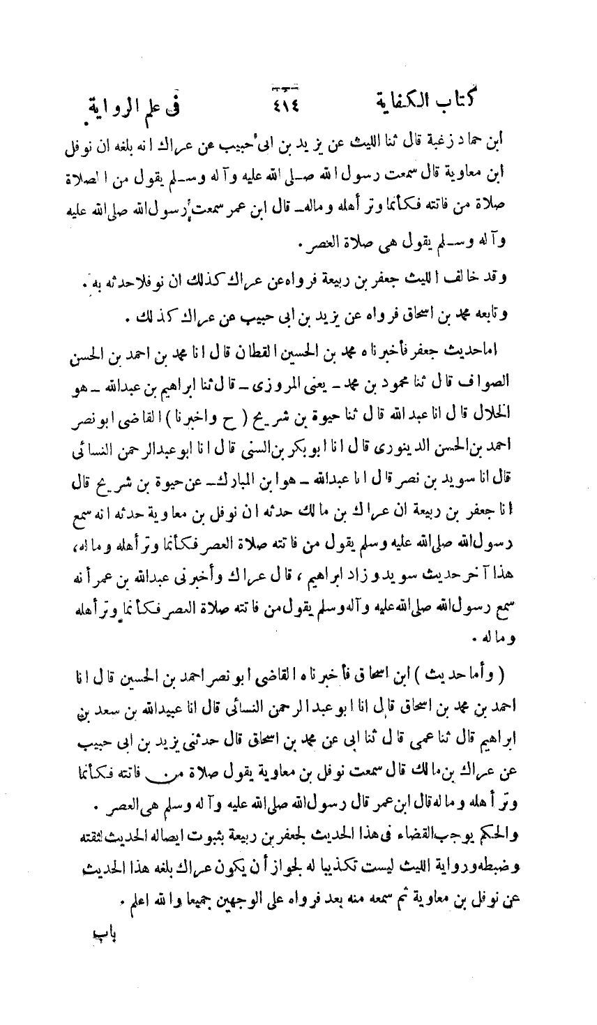 أَمَّا حَدِيثُ جَعْفَرٍ فَأَخْبَرَناهُ مُحَمَّدُ بْنُ الْحُسَيْنِ الْقَطَّانُ، أنا مُحَمَّدُ بْنُ أَحْمَدَ بْنِ الْحَسَنِ الصَّوَّافُ، ثنا مَحْمُودُ بْنُ مُحَمَّدٍ يَعْنِي الْمَرْوَزِيَّ، ثنا إِبْرَاهِيمُ بْنُ عَبْدِ اللَّهِ هُوَ الْخَلَّالُ، أنا عَبْدُ اللَّهِ، ثنا حَيْوَةُ بْنُ شُرَيْحٍ , ح وَأَخْبَرَنا الْقَاضِي أَبُو نَصْرٍ أَحْمَدُ بْنُ الْحُسَيْنِ الدِّينَوَرِيُّ، أنا أَبُو بَكْرِ ابْنُ السُّنِّيِّ، أنا أَبُو عَبْدِ الرَّحْمَنِ النَّسَائِيُّ، أنا سُوَيْدُ بْنُ نَصْرٍ , قَالَ: أنا عَبْدُ اللَّهِ هُوَ ابْنُ الْمُبَارَكِ عَنْ حَيْوَةَ بْنِ شُرَيْحٍ، أنا جَعْفَرُ بْنُ رَبِيعَةَ , أَنَّ عِرَاكَ بْنَ مَالِكٍ , حَدَّثَهُ أَنَّ نَوْفَلَ بْنَ مُعَاوِيَةَ حَدَّثَهُ أَنَّهُ سَمِعَ رَسُولَ اللَّهِ صَلَّى اللهُ عَلَيْهِ وَسَلَّمَ يَقُولُ: §«مَنْ فَاتَتْهُ صَلَاةُ الْعَصْرِ فَكَأَنَّمَا وُتِرَ أَهْلُهُ وَمَالُهُ» هَذَا آخِرُ حَدِيثِ سُوَيْدٍ , وَزَادَ إِبْرَاهِيمُ: قَالَ عِرَاكٌ: وَأَخْبَرَنِي عَبْدُ اللَّهِ بْنُ عُمَرَ أَنَّهُ سَمِعَ رَسُولَ اللَّهِ صَلَّى اللهُ عَلَيْهِ وَسَلَّمَ يَقُولُ: «مَنْ فَاتَتْهُ صَلَاةُ الْعَصْرِ فَكَأَنَّمَا وُتِرَ أَهْلُهُ وَمَالُهُ»