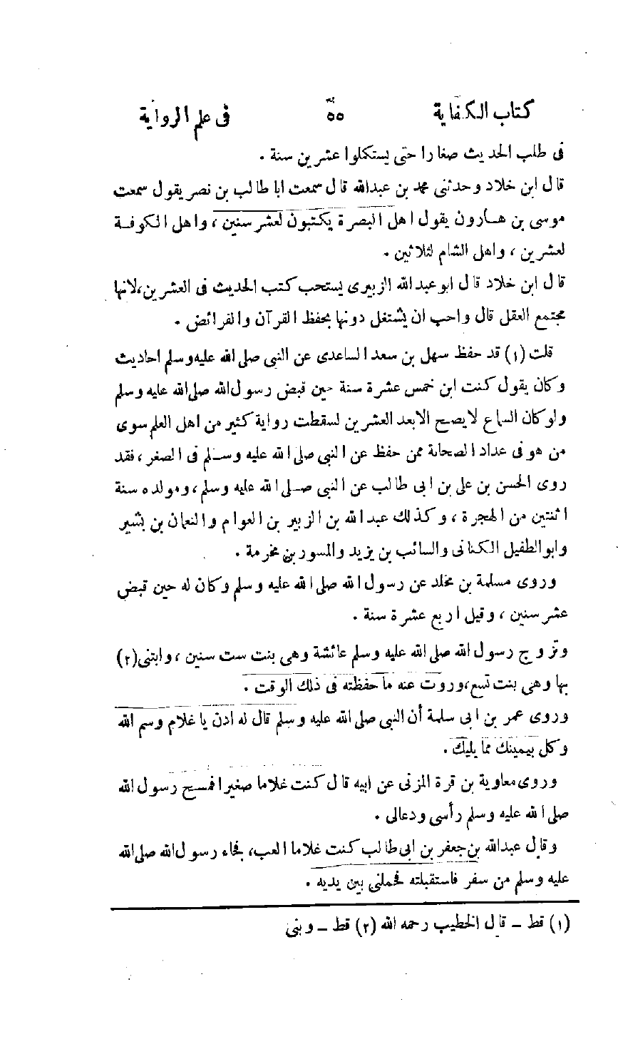قَالَ ابْنُ خَلَّادٍ: وَحَدَّثَنِي مُحَمَّدُ بْنُ عَبْدِ اللَّهِ , قَالَ: سَمِعْتُ أَبَا طَالِبِ بْنِ نَصْرٍ يَقُولُ: سَمِعْتُ مُوسَى بْنَ هَارُونَ يَقُولُ: §أَهْلُ الْبَصْرَةِ يَكْتُبُونَ لِعَشْرِ سِنِينَ , وَأَهْلُ الْكُوفَةِ لِعِشْرِينَ , وَأَهْلُ الشَّامِ لِثَلَاثِينَ , قَالَ ابْنُ خَلَّادٍ: قَالَ أَبُو عَبْدِ اللَّهِ الزُّبَيْرِيُّ: يُسْتَحَبُّ كَتْبُ الْحَدِيثِ فِي الْعِشْرِينَ , لِأَنَّهَا مُجْتَمَعُ الْعَقْلِ , قَالَ: وَأُحِبُّ أَنْ يَشْتَغِلَ دُونَهَا بِحِفْظِ الْقُرْآنِ وَالْفَرَائِضِ" قال الخطيب رَحِمَهُ اللَّهُ: قَدْ حَفِظَ سَهْلُ بْنُ سَعْدٍ السَّاعِدِيُّ عَنِ النَّبِيِّ صَلَّى اللَّهُ عَلَيْهِ وَسَلَّمَّ أَحَادِيثَ وَكَانَ يَقُولُ: كُنْتُ ابْنَ خَمْسَ عَشْرَةَ سَنَةً حِينَ قُبِضَ رَسُولُ اللَّهِ صَلَّى اللَّهُ عَلَيْهِ وَسَلَّمَّ , وَلَوْ كَانَ السَّمَاعُ لَا يَصِحُّ إِلَّا بَعْدَ الْعِشْرِينَ لَسَقَطَتْ رِوَايَةُ كَثِيرٍ مِنْ أَهْلِ الْعِلْمِ سِوَى مَنْ هُوَ فِي عِدَادِ الصَّحَابَةِ , مِمَّنْ حَفِظَ عَنِ النَّبِيِّ صَلَّى اللَّهُ عَلَيْهِ وَسَلَّمَّ فِي الصِّغَرِ , فَقَدْ رَوَى الْحَسَنُ بْنُ عَلِيِّ بْنِ أَبِي طَالِبٍ عَنِ النَّبِيِّ صَلَّى اللَّهُ عَلَيْهِ وَسَلَّمَّ وَمَوْلِدُهُ سَنَةَ اثْنَتَيْنِ مِنَ الْهِجْرَةِ , وَكَذَلِكَ عَبْدُ اللَّهِ بْنُ الزُّبَيْرِ بْنِ الْعَوَّامِ , وَالنُّعْمَانُ بْنُ بَشِيرٍ , وَأَبُو الطُّفَيْلِ الْكِتَانِيُّ , وَالسَّائِبُ بْنُ يَزِيدَ , وَالْمِسْوَرُ بْنُ مَخْرَمَةَ , وَرَوَى مَسْلَمَةُ بْنُ مَخْلَدٍ عَنْ رَسُولِ اللَّهِ صَلَّى اللَّهُ عَلَيْهِ وَسَلَّمَّ , وَكَانَ لَهُ حِينَ قُبِضَ عَشَرُ سِنِينَ , وَقِيلَ: أَرْبَعَ عَشْرَةَ سَنَةً , وَتَزَوَّجَ رَسُولُ اللَّهِ صَلَّى اللَّهُ عَلَيْهِ وَسَلَّمَّ عَائِشَةَ رَضِيَ اللَّهُ عَنْهَا وَهِيَ بِنْتُ سِتِّ سِنِينَ , وَبَنَى بِهَا وَهِيَ بِنْتُ تِسْعٍ , وَرَوَتْ عَنْهُ مَا حَفِظَتْهُ فِي ذَلِكَ الْوَقْتِ , وَرَوَى عُمَرُ بْنُ أَبِي سَلَمَةَ أَنَّ النَّبِيَّ صَلَّى اللَّهُ عَلَيْهِ وَسَلَّمَّ قَالَ لَهُ: ادْنُ يَا غُلَامُ وَسَمِّ اللَّهَ وَكُلْ بِيَمِينِكَ مِمَّا يَلِيكَ" , وَرَوَى مُعَاوِيَةُ بْنُ قُرَّةَ الْمُزَنِيُّ عَنْ أَبِيهِ قَالَ: كُنْتُ غُلَامًا صَغِيرًا , فَمَسَحَ رَسُولُ اللَّهِ صَلَّى اللَّهُ عَلَيْهِ وَسَلَّمَّ رَأْسِي وَدَعَا لِي". وَقَالَ عَبْدُ اللَّهِ بْنُ جَعْفَرِ بْنِ أَبِي طَالِبٍ: كُنْتُ غُلَامًا أَلْعَبُ فَجَاءَ رَسُولُ اللَّهِ صَلَّى اللَّهُ عَلَيْهِ وَسَلَّمَّ مِنْ سَفَرٍ فَاسْتَقْبَلْتُهُ فَحَمَلَنِي بَيْنَ يَدَيْهِ"