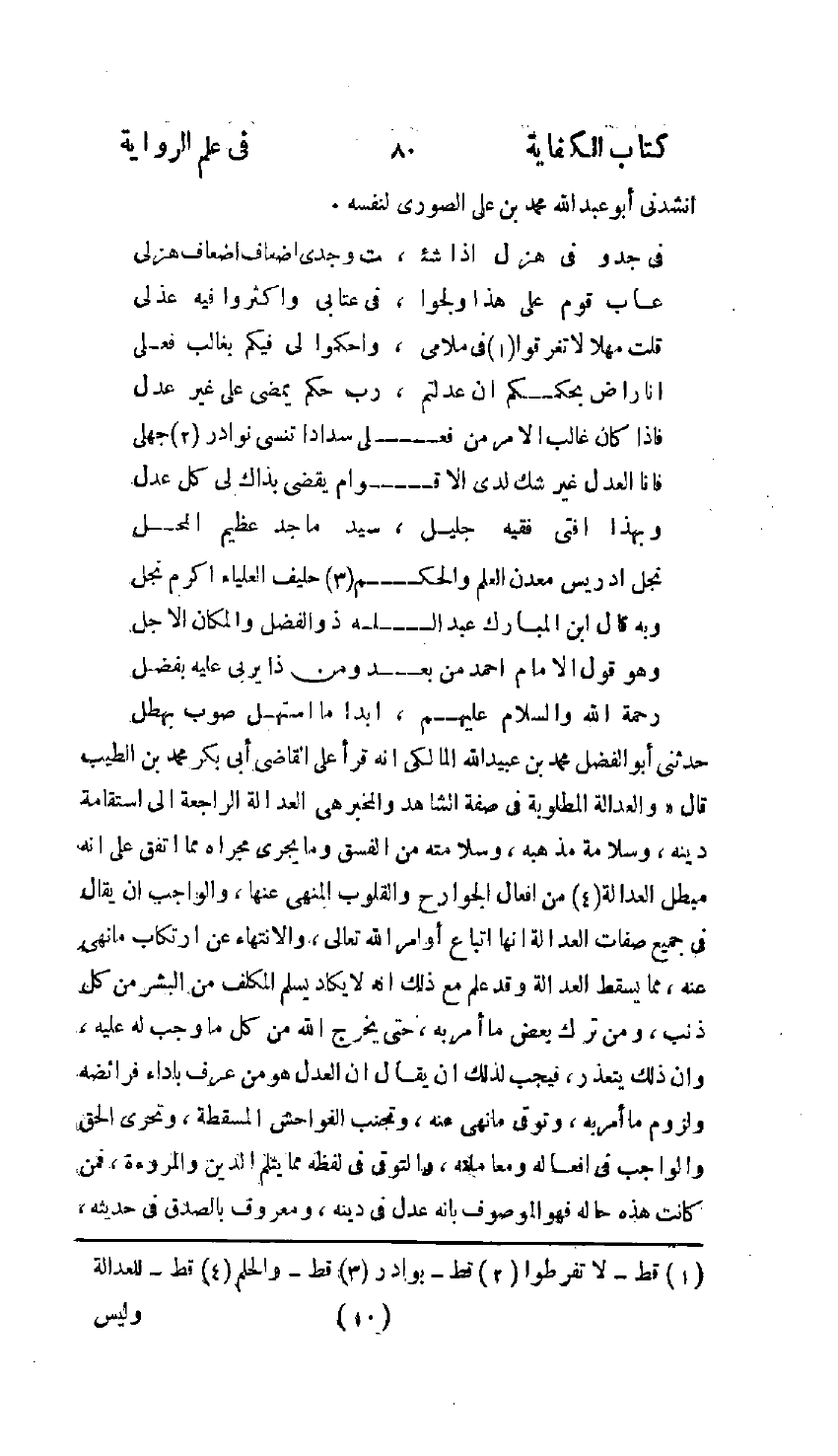 حَدَّثَنِي أَبُو الْفَضْلِ مُحَمَّدُ بْنُ عُبَيْدِ اللَّهِ الْمَالِكِيُّ أَنَّهُ قَرَأَ عَلَى الْقَاضِي أَبِي بَكْرٍ مُحَمَّدِ بْنِ الطَّيِّبِ , قَالَ: §وَالْعَدَالَةُ الْمَطْلُوبَةُ فِي صِفَةِ الشَّاهِدِ وَالْمُخْبِرِ هِيَ الْعَدَالَةُ الرَّاجِعَةُ إِلَى اسْتِقَامَةِ دِينِهِ , وَسَلَامَةِ مَذْهَبِهِ , وَسَلَامَتِهِ مِنَ الْفِسْقِ وَمَا يُجْرَى مُجْرَاهُ , مِمَّا اتُّفِقَ عَلَى أَنَّهُ مُبْطِلٌ لِلْعَدَالَةِ مِنْ أَفْعَالِ الْجَوَارِحِ وَالْقُلُوبِ الْمَنْهِيِّ عَنْهَا , وَالْوَاجِبُ أَنْ يُقَالَ فِي جَمِيعِ صِفَاتِ الْعَدَالَةِ: إِنَّهَا اتِّبَاعُ أَوَامِرِ اللَّهِ تَعَالَى , وَالِانْتِهَاءُ عَنِ ارْتِكَابِ مَا نَهَى عَنْهُ مِمَّا يُسْقِطُ الْعَدَالَةَ , وَقَدْ عُلِمَ مَعَ ذَلِكَ أَنَّهُ لَا يَكَادُ يَسْلَمُ الْمُكَلَّفُ مِنَ الْبَشَرِ مِنْ كُلِّ ذَنْبٍ , وَمِنْ تَرْكِ بَعْضِ مَا أُمِرَ بِهِ , حَتَّى يَخْرُجَ لِلَّهِ مِنْ كُلِّ مَا وَجَبَ لَهُ عَلَيْهِ , وَأَنَّ ذَلِكَ يَتَعَذَّرُ , فَيَجِبُ لِذَلِكَ أَنْ يُقَالَ: إِنَّ الْعَدْلَ هُوَ مَنْ عُرِفَ بِأَدَاءِ فَرَائِضِهِ وَلُزُومِ مَا أُمِرَ بِهِ , وَتَوَقِّي مَا نُهِيَ عَنْهُ , وَتَجَنُّبِ الْفَوَاحِشِ الْمُسْقِطَةِ , وَتَحَرِّي الْحَقِّ وَالْوَاجِبِ فِي أَفْعَالِهِ وَمُعَامَلَتِهِ , وَالتَّوَقِّي فِي لَفْظِهِ مَا يَثْلِمُ الدِّينَ وَالْمُرُوءَةَ , فَمَنْ كَانَتْ هَذِهِ حَالَهُ فَهُوَ الْمَوْصُوفُ بِأَنَّهُ عَدْلٌ فِي دِينِهِ , وَمَعْرُوفٌ بِالصِّدْقِ فِي حَدِيثِهِ , وَلَيْسَ يَكْفِيهِ فِي ذَلِكَ اجْتِنَابُ كَبَائِرِ الذُّنُوبِ الَّتِي يُسَمَّى فَاعِلُهَا فَاسِقًا , حَتَّى يَكُونَ مَعَ ذَلِكَ مُتَوَقِّيًا لِمَا يَقُولُ كَثِيرٌ مِنَ النَّاسِ إِنَّهُ لَا يَعْلَمُ أَنَّهُ كَبِيرٌ , بَلْ يَجُوزُ أَنْ يَكُونَ صَغِيرًا , نَحْوَ الْكَذِبِ الَّذِي لَا يُقْطَعُ عَلَى أَنَّهُ كَبِيرٌ , وَنَحْوَ التَّطْفِيفِ بِحَبَّةٍ وَسِرْقَةِ بَاذِنْجَانَةٍ وَغِشِّ الْمُسْلِمِينَ بِمَا لَا يُقْطَعُ عِنْدَهُمْ عَلَى أَنَّهُ كَبِيرٌ مِنَ الذُّنُوبِ , لِأَجْلِ أَنَّ الْقَاذُورَاتِ وَإِنْ لَمْ يُقْطَعْ عَلَى أَنَّهَا كَبَائِرُ يُسْتَحَقُّ بِهَا الْعِقَابُ , فَقَدِ اتُّفِقَ عَلَى أَنَّ فَاعِلَهَا غَيْرُ مَقْبُولِ الْخَبَرِ وَالشَّهَادَةِ , إِمَّا لِأَنَّهَا مُتَّهِمَةٌ لِصَاحِبِهَا وَمُسْقِطَةٌ لَهُ وَمَانِعَةٌ مِنْ ثِقَتِهِ وَأَمَانَتِهِ , أَوْ لِغَيْرِ ذَلِكَ , فَإِنَّ الْعَادَةَ مَوْضُوعَةٌ عَلَى أَنَّ مَنِ احْتَمَلَتْ أَمَانَتُهُ سَرِقَةَ بَصَلَةٍ وَتَطْفِيفَ حَبَّةٍ , احْتَمَلَتِ الْكَذِبَ وَأَخْذَ الرُّشَا عَلَى الشَّهَادَةِ وَوَضْعَ الْكَذِبِ فِي الْحَدِيثِ وَالِاكْتِسَابَ بِهِ , فَيَجِبُ أَنْ تَكُونَ هَذِهِ الذُّنُوبُ فِي إِسْقَاطِهَا لِلْخَبَرِ وَالشَّهَادَةِ بِمَثَابَةِ مَا اتُّفِقَ عَلَى أَنَّهُ فِسْقٌ يُسْتَحَقُّ بِهِ الْعِقَابُ , وَجَمِيعُ مَا أَضْرَبْنَا عَنْ ذِكْرِهِ مِمَّا لَا يَقْطَعُ قَوْمٌ عَلَى أَنَّهُ كَبِيرٌ , وَقَدِ اتُّفِقَ عَلَى وُجُوبِ رَدِّ خَبَرِ فَاعِلِهِ وَشَهَادَتِهِ , فَهَذِهِ سَبِيلُهُ فِي أَنَّهُ يَجِبُ كَوْنُ الشَّاهِدِ وَالْمُخْبِرِ سَلِيمًا مِنْهُ , وَالْوَاجِبُ عِنْدَنَا أَنْ لَا يَرُدَّ الْخَبَرُ وَلَا الشَّهَادَةُ إِلَّا بِعِصْيَانٍ قَدِ اتُّفِقَ عَلَى رَدِّ الْخَبَرِ وَالشَّهَادَةِ بِهِ , وَمَا يَغْلِبُ بِهِ ظَنُّ الْحَاكِمِ وَالْعَالِمِ أَنَّ مُقْتَرِفَهُ غَيْرُ عَدْلٍ وَلَا مَأْمُونٍ عَلَيْهِ الْكَذِبُ فِي الشَّهَادَةِ , وَالْخَبَرِ وَلَوْ عَمِلَ الْعُلَمَاءُ وَالْحُكَّامُ عَلَى أَنْ لَا يَقْبَلُوا خَبَرًا وَلَا شَهَادَةً إِلَّا مِنْ مُسْلِمٍ بَرِيءٍ مِنْ كُلِّ ذَنْبٍ قَلَّ أَوْ كَثُرَ لَمْ يُمْكِنْ ق