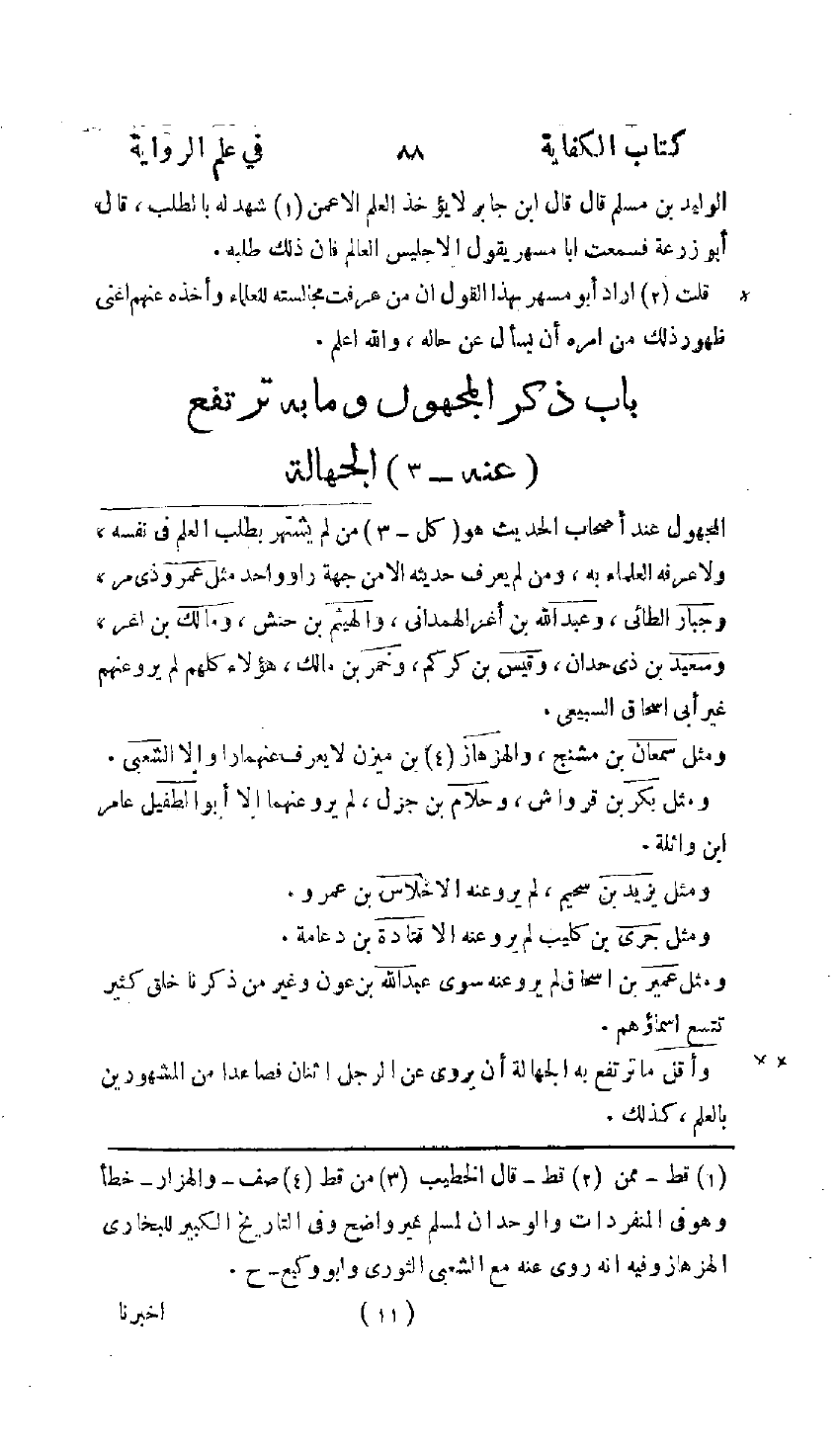§بَابُ ذِكْرِ الْمَجْهُولِ وَمَا بِهِ تَرْتَفِعُ عَنْهُ الْجَهَالَةُ الْمَجْهُولُ عِنْدَ أَصْحَابِ الْحَدِيثِ: هُوَ كُلُّ مَنْ لَمْ يُشْتَهَرُ بِطَلَبِ الْعِلْمِ فِي نَفْسِهِ , وَلَا عَرَفَهُ الْعُلَمَاءُ بِهِ , وَمَنْ لَمْ يُعْرَفْ حَدِيثُهُ إِلَّا مِنْ جِهَةِ رَاو وَاحِدٍ , مِثْلُ عَمْرٍو ذِي مُرٍّ وَجَبَّارٍ الطَّائِيِّ وَعَبْدِ اللَّهِ بْنِ أَغَرَّ الْهَمْدَانِيِّ وَالْهَيْثَمِ بْنِ حَنَشٍ وَمَالِكِ بْنِ أَغَرَّ وَسَعِيدِ بْنِ ذِي جُدَّانَ وَقَيْسِ بْنِ كُرْكُمٍ وَخَمِرِ بْنِ مَالِكٍ , وَهَؤُلَاءِ كُلُّهُمْ لَمْ يَرْوِ عَنْهُمْ غَيْرُ أَبِي إِسْحَاقَ السَّبِيعِيِّ , وَمِثْلُ سَمْعَانَ بْنَ مُشَنَّجٍ وَالْهِزْهَازِ بْنِ مِيزَنٍ لَا يُعْرَفُ عَنْهُمَا رَاوٍ إِلَّا الشَّعْبِيُّ , وَمِثْلُ بَكْرِ بْنِ قِرْوَاشٍ وَحَلَامِ بْنِ جَزْلٍ لَمْ يَرْوِ عَنْهُمَا إِلَّا أَبُو الطُّفَيْلِ عَامِرُ بْنُ وَاثِلَةَ , وَمِثْلُ يَزِيدَ بْنِ سُحَيْمٍ لَمْ يَرْوِ عَنْهُ إِلَّا خِلَاسُ بْنُ عَمْرٍو , وَمِثْلُ جُرَيِّ بْنِ كُلَيْبٍ لَمْ يَرْوِ عَنْهُ إِلَّا قَتَادَةُ بْنُ دِعَامَةَ , وَمِثْلُ عُمَيْرِ بْنِ إِسْحَاقَ لَمْ يَرْوِ عَنْهُ سِوَى عَبْدِ اللَّهِ بْنِ عَوْنٍ , وَغَيْرُ مَنْ ذَكَرْنَا خَلْقٌ كَثِيرٌ تَتَّسِعُ أَسْمَاؤُهُمْ , وَأَقَلُّ مَا تَرْتَفِعُ بِهِ الْجَهَالَةُ أَنْ يَرْوِيَ عَنِ الرَّجُلِ اثْنَانِ فَصَاعِدًا مِنَ الْمَشْهُورِينَ بِالْعِلْمِ كَذَلِكَ