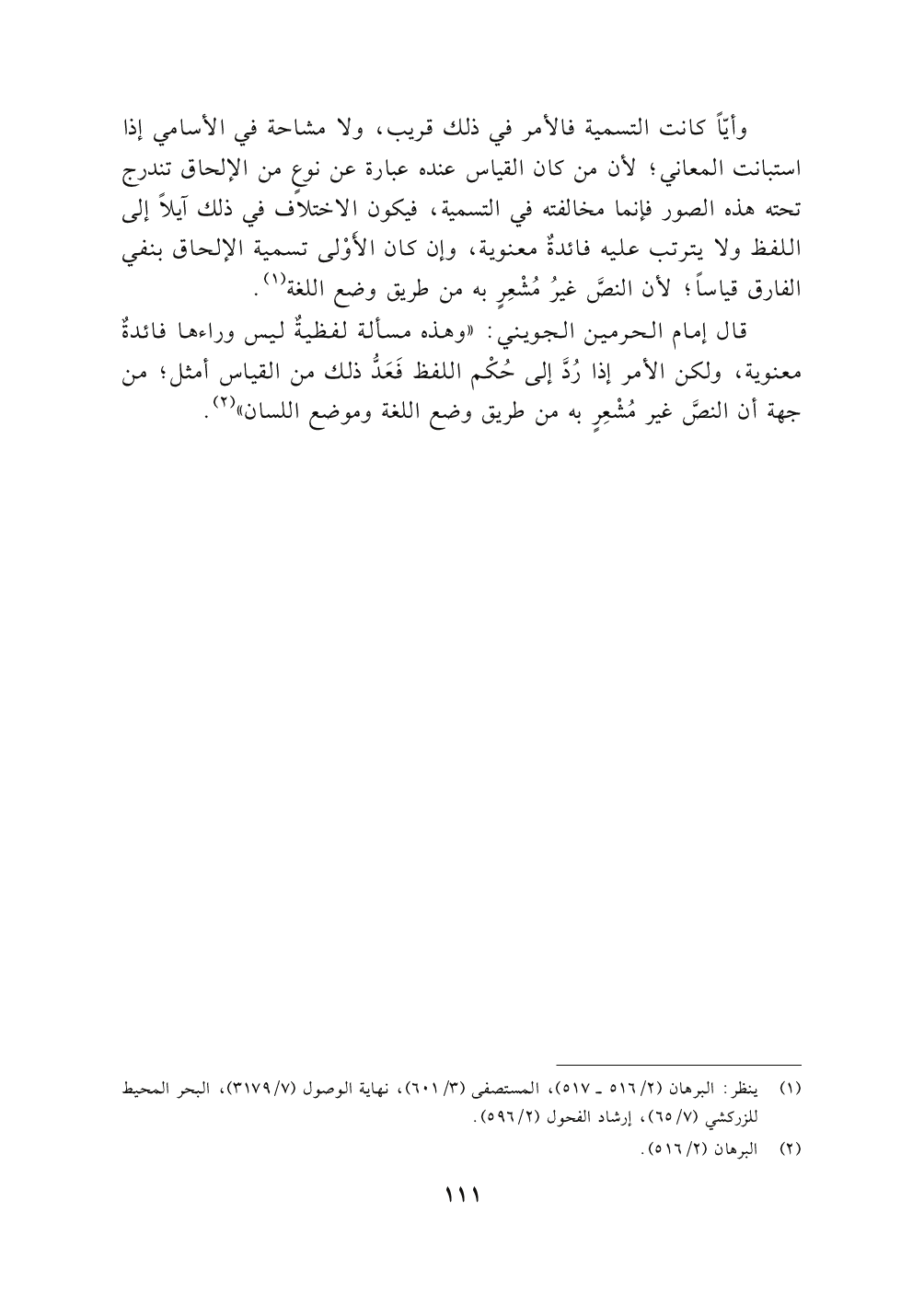 قال إمام الحرمين الجويني (٢): " وهذه مسألة لفظيةٌ ليس وراءها فائدةٌ معنوية، ولكن الأمر إذا رُدَّ إلى حُكْم اللفظ فَعَدُّ ذلك من القياس أمثل؛ من جهة أن النصَّ غير مُشْعِرٍ به من طريق وضع اللغة وموضع اللسان" (٣).
