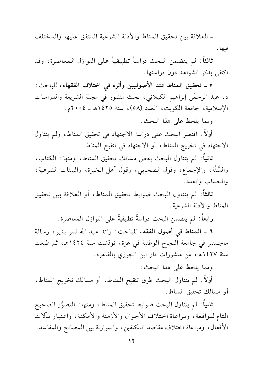 ٥ - تحقيق المناط عند الأصوليين وأثره في اختلاف الفقهاء, للباحث: د. عبدالرحمن إبراهيم الكيلاني, بحث منشور في مجلة الشريعة والدراسات الإسلامية ,جامعة الكويت, العدد ٥٨, سنة ١٤٢٥ هـ -٢٠٠٤ م.