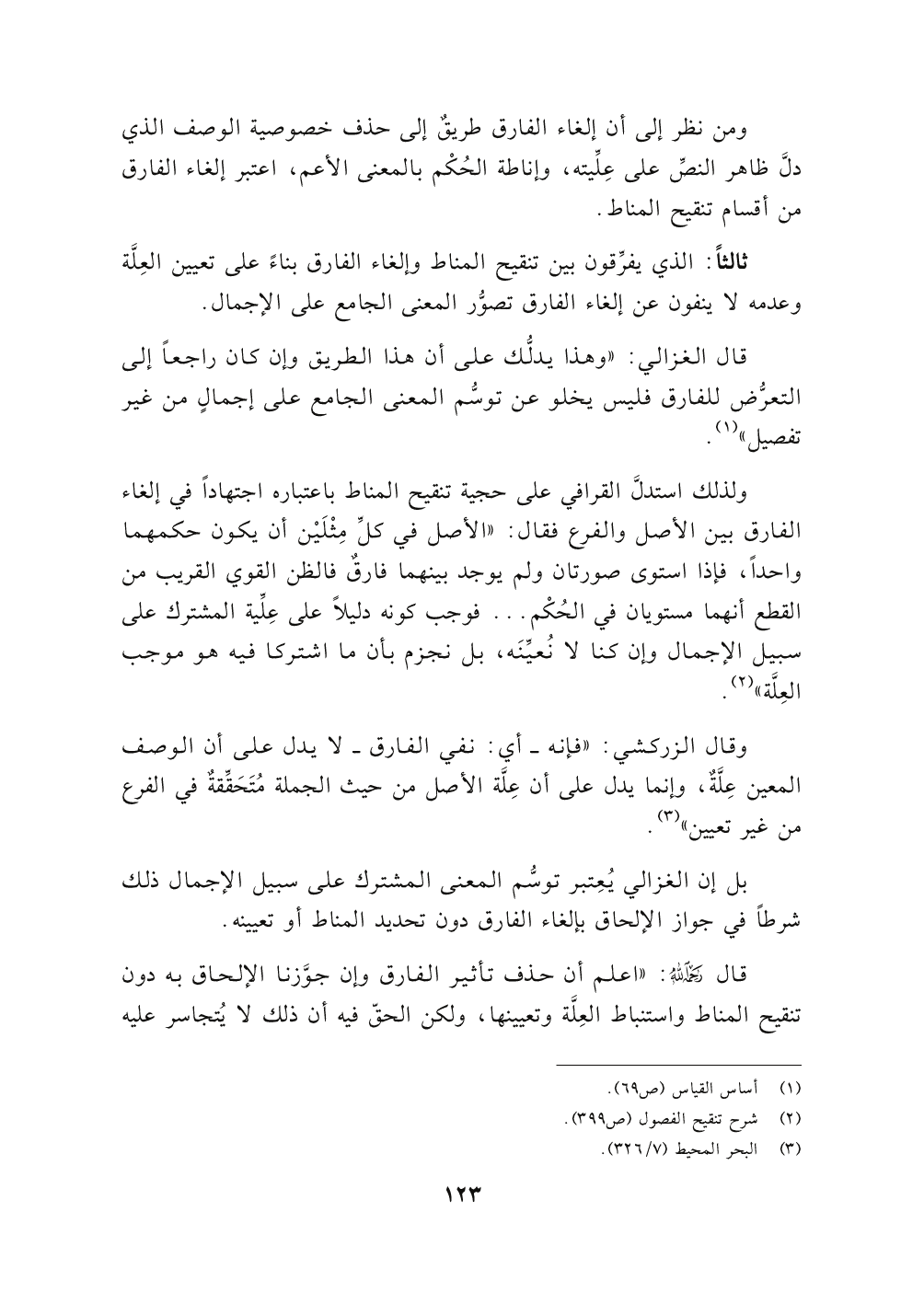 ولذلك استدلَّ القرافي على حجية تنقيح المناط باعتباره اجتهاداً في إلغاء الفارق بين الأصل والفرع فقال: "الأصل في كلِّ مِثْلَيْن أن يكون حكمهما واحداً، فإذا استوى صورتان ولم يوجد بينهما فارقٌ فالظن القوي القريب من القطع أنهما مستويان في الحُكْم. . . فوجب كونه دليلاً على عِلِّية المشترك على سبيل الإجمال وإن كنا لا نُعيِّنَه، بل نجزم بأن ما اشتركا فيه هو موجب العِلَّة" (٢).