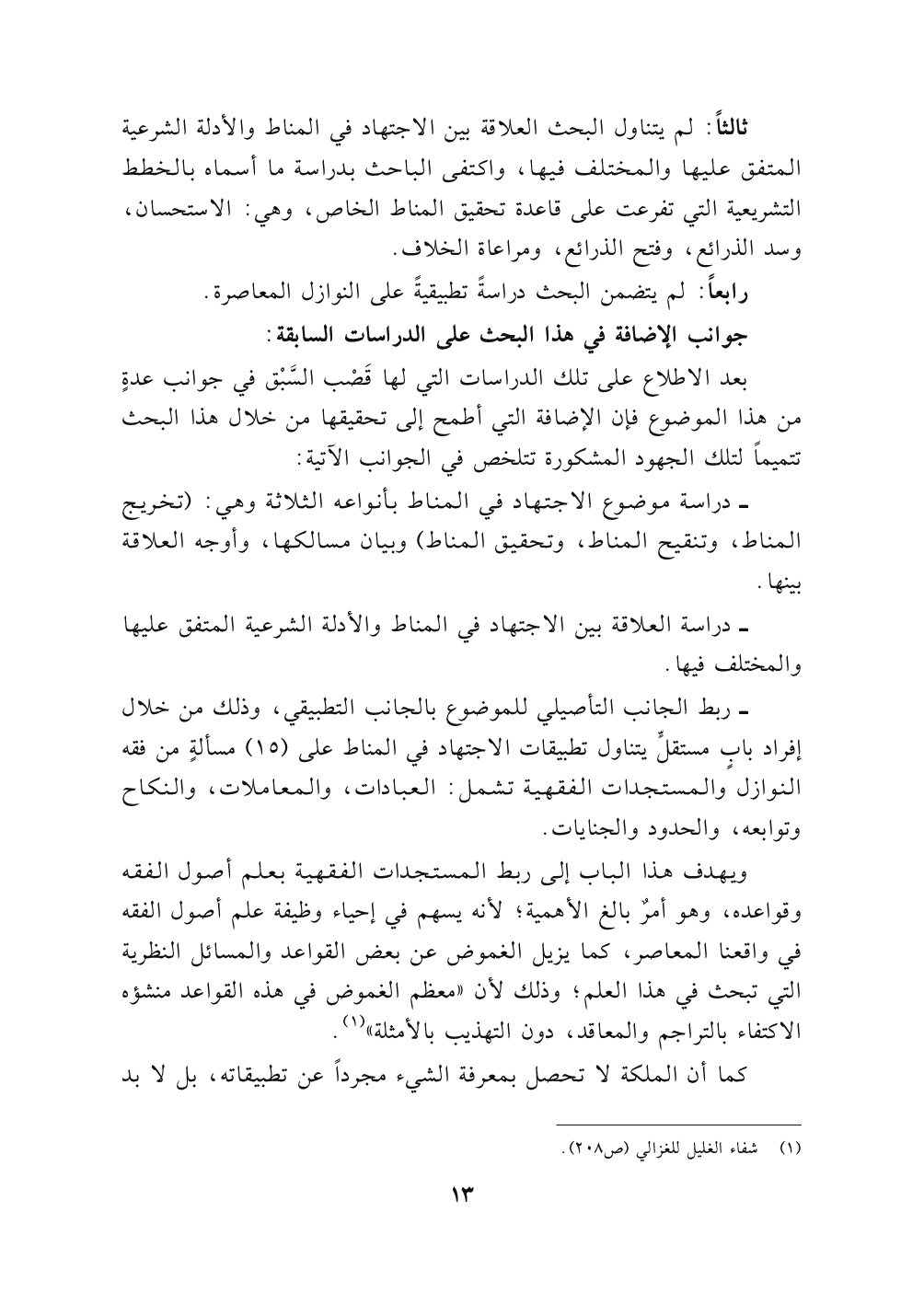 -ربط الجانب التأصيلي للموضوع بالجانب التطبيقي ,وذلك من خلال إفراد بابٍ مستقلٍ يتناول تطبيقات الاجتهاد في المناط على (١٥) مسألةٍ من فقه النوازل والمستجدات الفقهية تشمل: العبادات, والمعاملات, والنكاح وتوابعه, والحدود والجنايات.