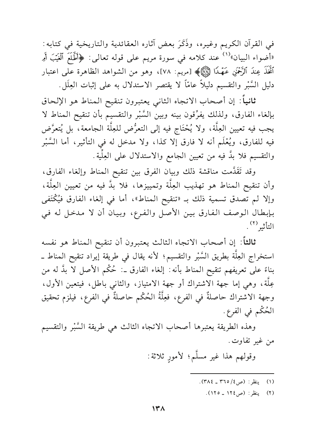 في القرآن الكريم وغيره، وذَكَرَ بعض آثاره العقائدية والتاريخية في كتابه: " أضواء البيان" (١) عند كلامه في سورة مريم على قوله تعالى: {أَطَّلَعَ الْغَيْبَ أَمِ اتَّخَذَ عِنْدَ الرَّحْمَنِ عَهْدًا (٧٨)} [مريم: ٧٨]، وهو من الشواهد الظاهرة على اعتبار دليل السَّبْر والتقسيم دليلاً عاماً لا يقتصر الاستدلال به على إثبات العِلَل.
