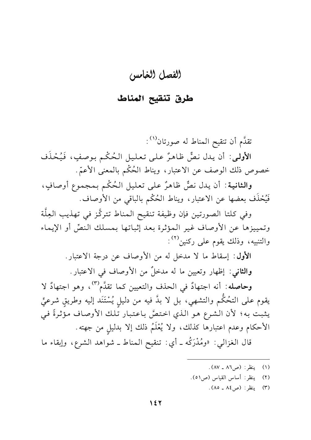 وفي كلتا الصورتين فإن وظيفة تنقيح المناط تتركَّز في تهذيب العِلَّة وتمييزها عن الأوصاف غير المؤثرة بعد إثباتها بمسلك النصِّ أو الإيماء والتنبيه، وذلك يقوم على ركنين (٢):