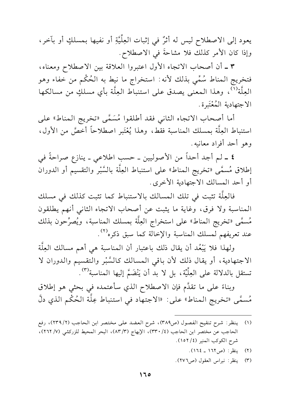 فالعِلَّة تثبت في تلك المسالك بالاستنباط كما تثبت كذلك في مسلك المناسبة ولا فرق، وغاية ما يثبت عن أصحاب الاتجاه الثاني أنهم يطلقون مُسمَّى " تخريج المناط " على استخراج العِلَّة بمسلك المناسبة، ويُصرِّحون بذلك عند تعريفهم لمسلك المناسبة والإخالة كما سبق ذكره (٢).