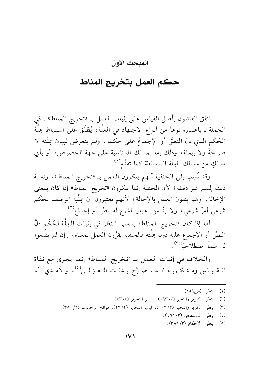 أما إذا كان " تخريج المناط " بمعنى النظر في إثبات العِلَّة لحُكْمٍ دلَّ النصُّ أو الإجماع عليه دون عِلَّته فالحنفية يقرُّون العمل بمعناه، وإن لم يضعوا له اسماً اصطلاحياً (٣).