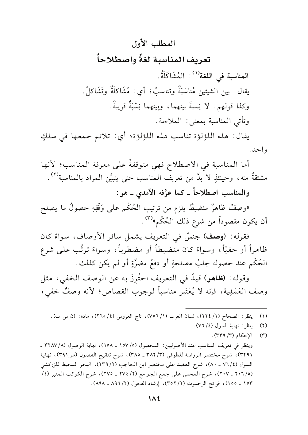 وينظر في تعريف المناسب عند الأصوليين: المحصول (٥/ ١٥٧ - ١٥٨)، نهاية الوصول (٨/ ٣٢٨٧ - ٣٢٩١)، شرح مختصر الروضة للطوفي (٣/ ٣٨٢ - ٣٨٥)، شرح تنقيح الفصول (٣٩١)، نهاية السول (٤/ ٧٦ - ٨٠)، شرح العضد على مختصر ابن الحاجب (٢/ ٢٣٩)، البحر المحيط للزركشي (٥/ ٢٠٦ - ٢٠٧)، شرح المحلي على جمع الجوامع (٢/ ٢٧٤ - ٢٧٥)، شرح الكوكب المنير (٤/ ١٥٣ - ١٥٥)، فواتح الرحموت (٢/ ٣٥٢)، إرشاد الفحول (٢/ ٨٩٦ - ٨٩٨).