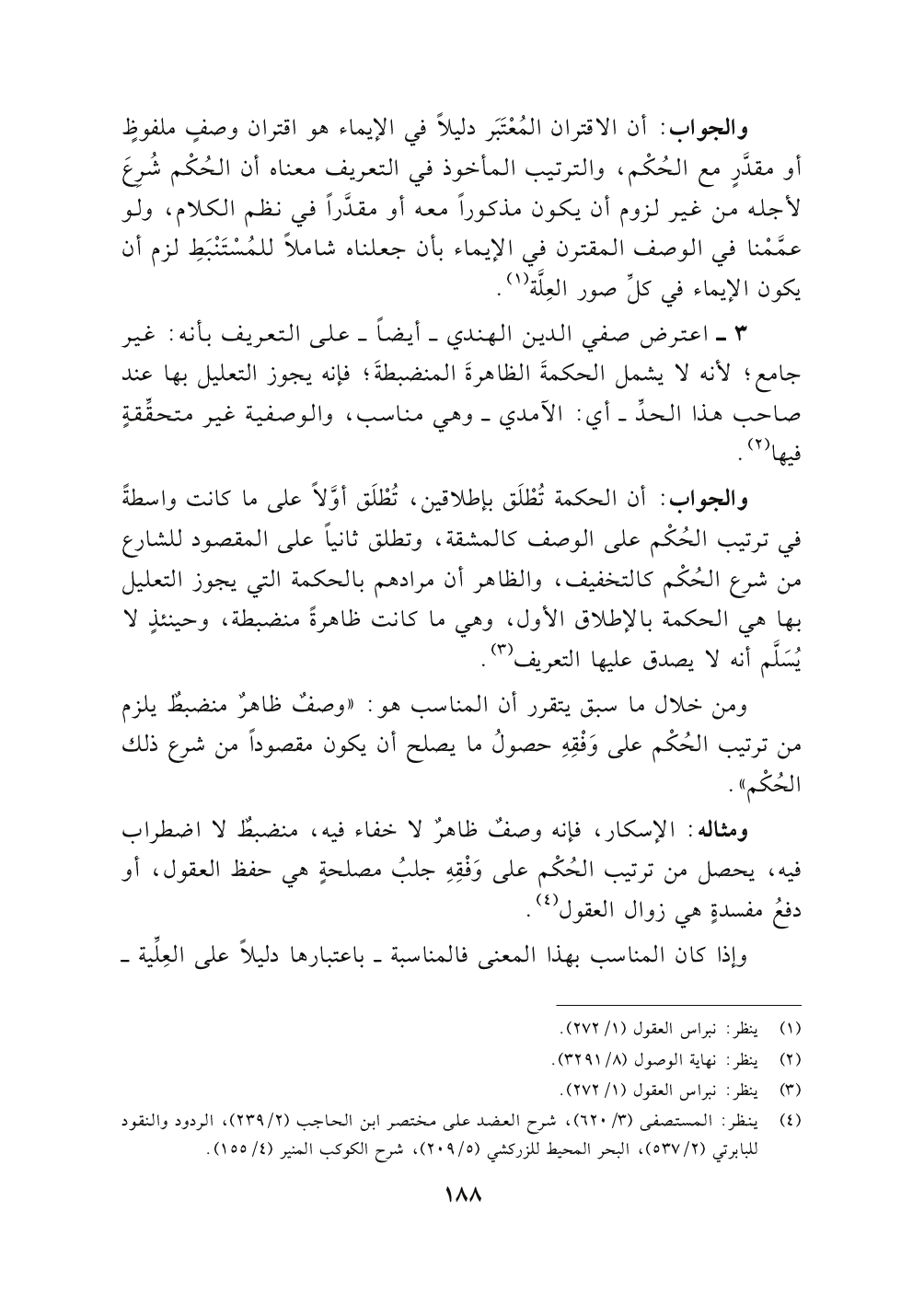 ٣ - اعترض صفي الدين الهندي - أيضاً - على التعريف بأنه: غير جامع؛ لأنه لا يشمل الحكمةَ الظاهرةَ المنضبطةَ؛ فإنه يجوز التعليل بها عند صاحب هذا الحدِّ - أي: الآمدي - وهي مناسب، والوصفية غير متحقِّقةٍ فيها (٢).