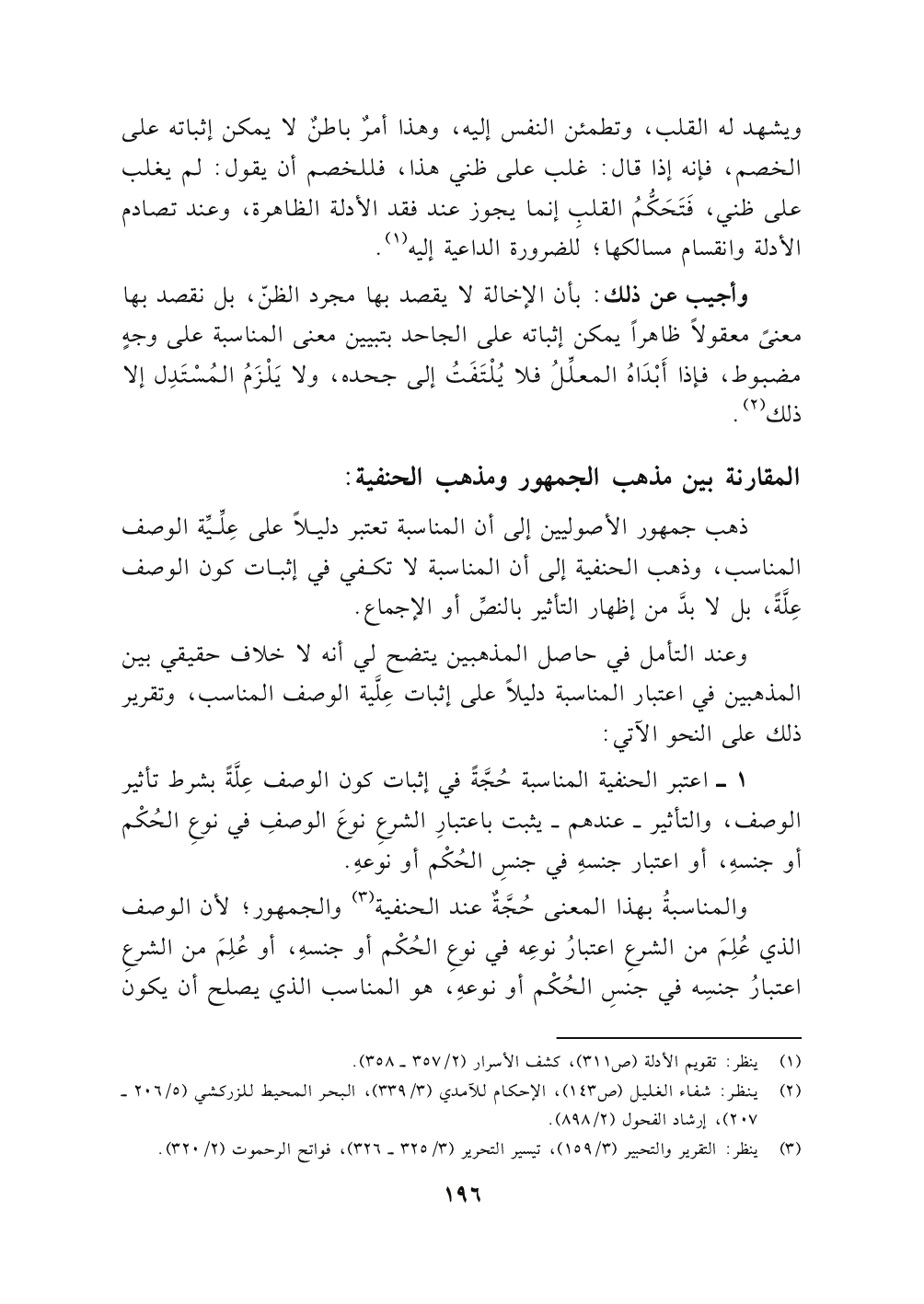 وعند التأمل في حاصل المذهبين يتضح لي أنه لا خلاف حقيقي بين المذهبين في اعتبار المناسبة دليلاً على إثبات عِلَّية الوصف المناسب، وتقرير ذلك على النحو الآتي: