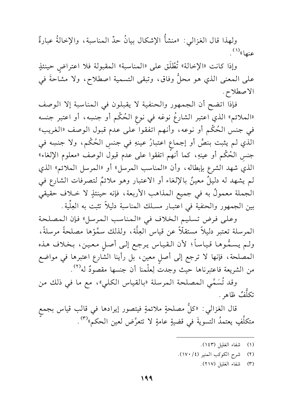 فإذا اتضح أن الجمهور والحنفية لا يقبلون في المناسبة إلا الوصف " الملائم" الذي اعتبر الشارعُ نوعَه في نوعِ الحُكْم أو جنسِه، أو اعتبر جنسه في جنس الحُكْم أو نوعه، وأنهم اتفقوا على عدم قبول الوصف " الغريب " الذي لم يثبت بنصٍّ أو إجماعٍ اعتبارُ عينهِ في جنسِ الحُكْم، ولا جنسِه في جنسِ الحُكْم أو عينهِ، كما أنهم اتفقوا على عدم قبول الوصف " معلوم الإلغاء " الذي شهد الشرع بإبطاله، وأن ... " المناسب المرسل " أو" المرسل الملائم " الذي لم يشهد له دليلٌ معينٌ بالإلغاء أو الاعتبار وهو ملائمٌ لتصرفات الشارع في الجملة معمولٌ به في جميع المذاهب الأربعة، فإنه حينئذٍ لا خلاف حقيقي بين الجمهور والحنفية في اعتبار مسلك المناسبة دليلاً تثبت به العِلِّية.
