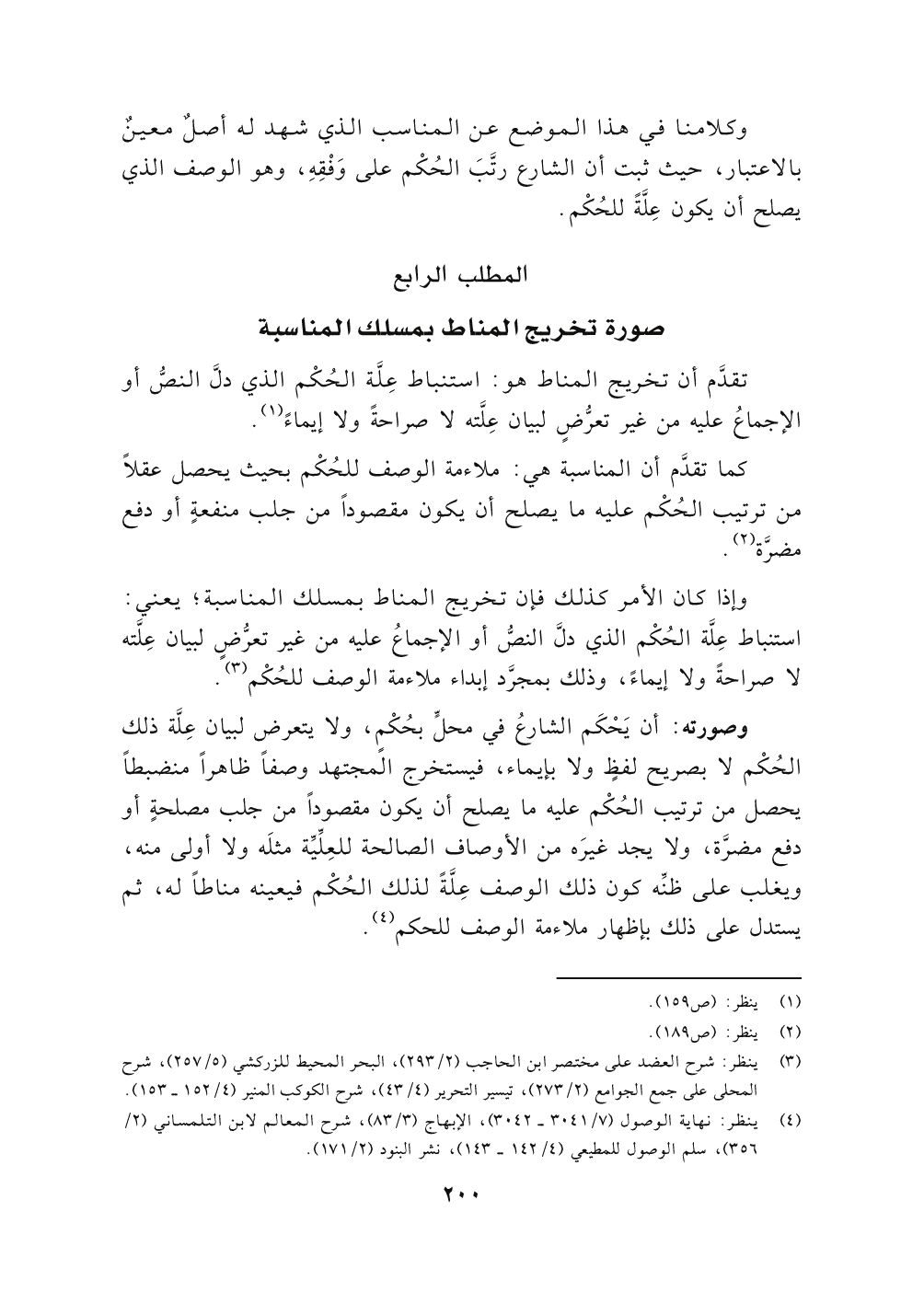 وإذا كان الأمر كذلك فإن تخريج المناط بمسلك المناسبة يعني: استنباط عِلَّة الحُكْم الذي دلَّ النصُّ أو الإجماعُ عليه من غير تعرُّضٍ لبيان عِلَّته لا صراحةً ولا إيماءً، وذلك بمجرَّد إبداء ملاءمة الوصف للحُكْم (٣).