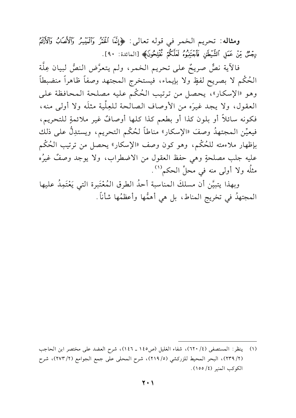 فالآية نصٌّ صريحٌ على تحريم الخمر، ولم يتعرَّض النصُّ لبيان عِلَّة الحُكْم لا بصريح لفظٍ ولا بإيماء، فيستخرج المجتهد وصفاً ظاهراً منضبطاً وهو " الإسكار"، يحصل من ترتيب الحُكْم عليه مصلحة المحافظة على العقول، ولا يجد غيرَه من الأوصاف الصالحة للعِلِّية مثلَه ولا أولى منه، فكونه سائلاً أو بلون كذا أو بطعم كذا كلها أوصافٌ غير ملائمةٍ للتحريم، فيعيِّن المجتهدُ وصفَ " الإسكار " مناطاً لحُكْم التحريم، ويستدِلُّ على ذلك بإظهار ملاءمته للحُكْم، وهو كون وصف " الإسكار" يحصل من ترتيب الحُكْم عليه جلب مصلحةٍ وهي حفظ العقول من الاضطراب، ولا يوجد وصفٌ غيرُه مثلُه ولا أولى منه في محلِّ الحكم (١).