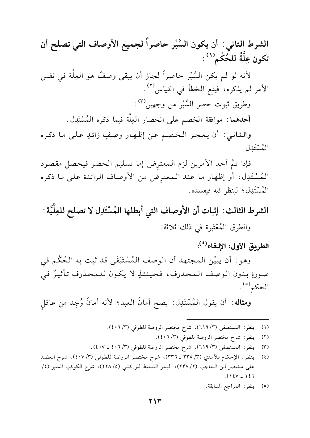 الشرط الثاني: أن يكون السَّبْر حاصراً لجميع الأوصاف التي تصلح أن تكون عِلَّةً للحُكْم (١).