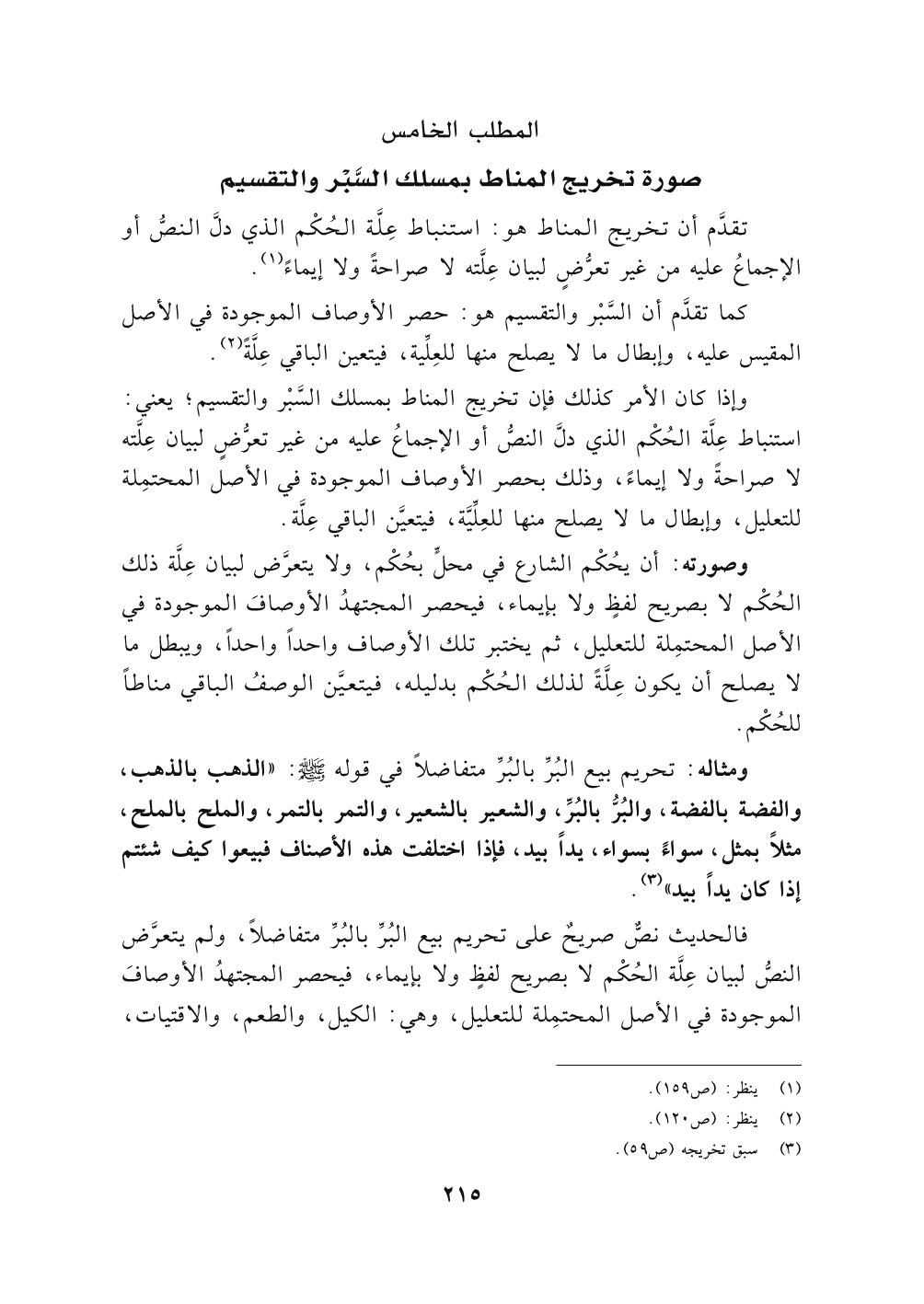 فالحديث نصٌّ صريحٌ على تحريم بيع البُرِّ بالبُرِّ متفاضلاً، ولم يتعرَّض النصُّ لبيان عِلَّة الحُكْم لا بصريح لفظٍ ولا بإيماء، فيحصر المجتهدُ الأوصافَ الموجودة في الأصل المحتمِلة للتعليل، وهي: الكيل، والطعم، والاقتيات،