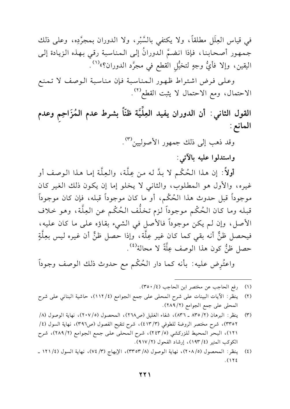 (٤) ينظر: المحصول (٥/ ٢٠٨)، نهاية الوصول (٨/ ٣٣٥٣)، الإبهاج (٣/ ٧٤)، نهاية السول