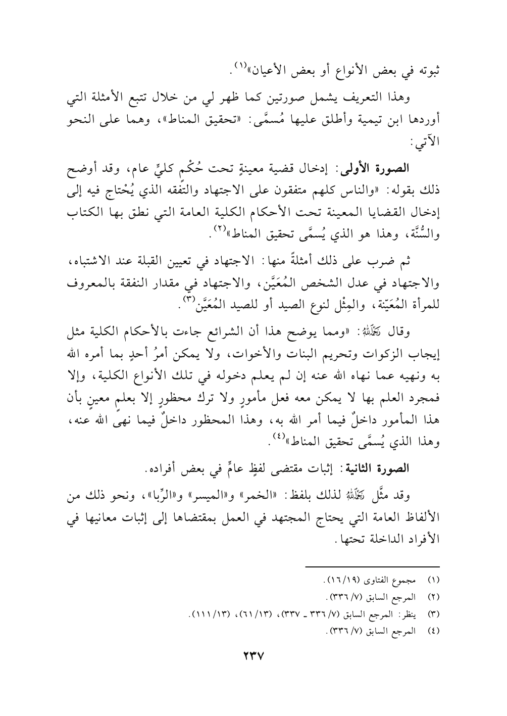 وهذا التعريف يشمل صورتين كما ظهر لي من خلال تتبع الأمثلة التي أوردها ابن تيمية وأطلق عليها مُسمَّى: " تحقيق المناط "، وهما على النحو الآتي: