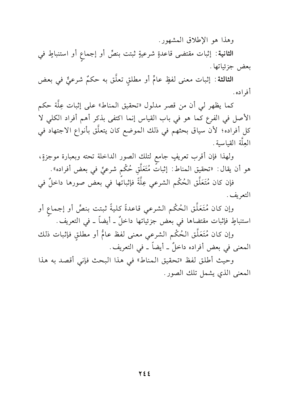 وحيث أطلق لفظ " تحقيق المناط" في هذا البحث فإني أقصد به هذا المعنى الذي يشمل تلك الصور.