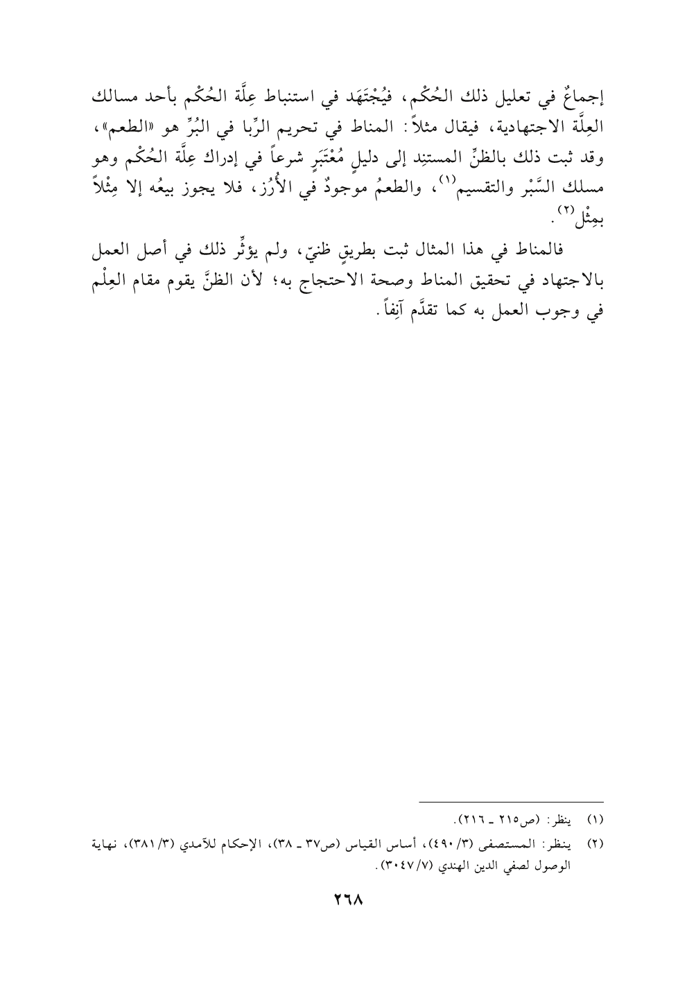إجماعٌ في تعليل ذلك الحُكْم، فيُجْتَهَد في استنباط عِلَّة الحُكْم بأحد مسالك العِلَّة الاجتهادية، فيقال مثلاً: المناط في تحريم الرِّبا في البُرِّ هو " الطعم "، وقد ثبت ذلك بالظنِّ المستنِد إلى دليلٍ مُعْتَبَرٍ شرعاً في إدراك عِلَّة الحُكْم وهو مسلك السَّبْر والتقسيم (١)، والطعمُ موجودٌ في الأُرُز، فلا يجوز بيعُه إلا مِثْلاً بمِثْل (٢).