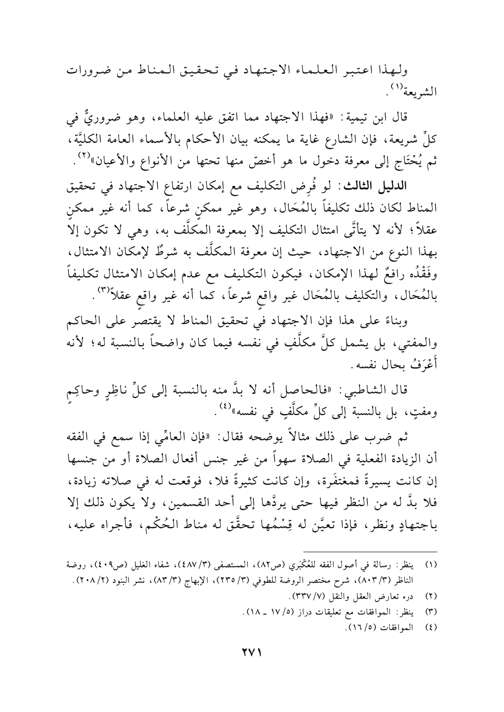 ولهذا اعتبر العلماء الاجتهاد في تحقيق المناط من ضرورات الشريعة (١).