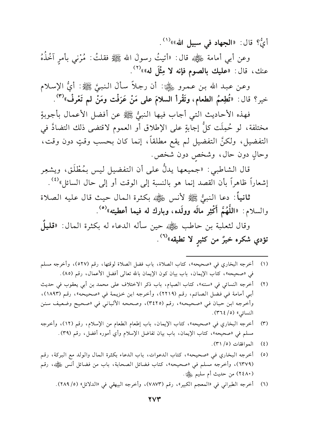 قال الشاطبي: " جميعها يدلُّ على أن التفضيل ليس بمُطْلَق، ويشعِر إشعاراً ظاهراً بأن القصد إنما هو بالنسبة إلى الوقت أو إلى حال السائل" (٦).