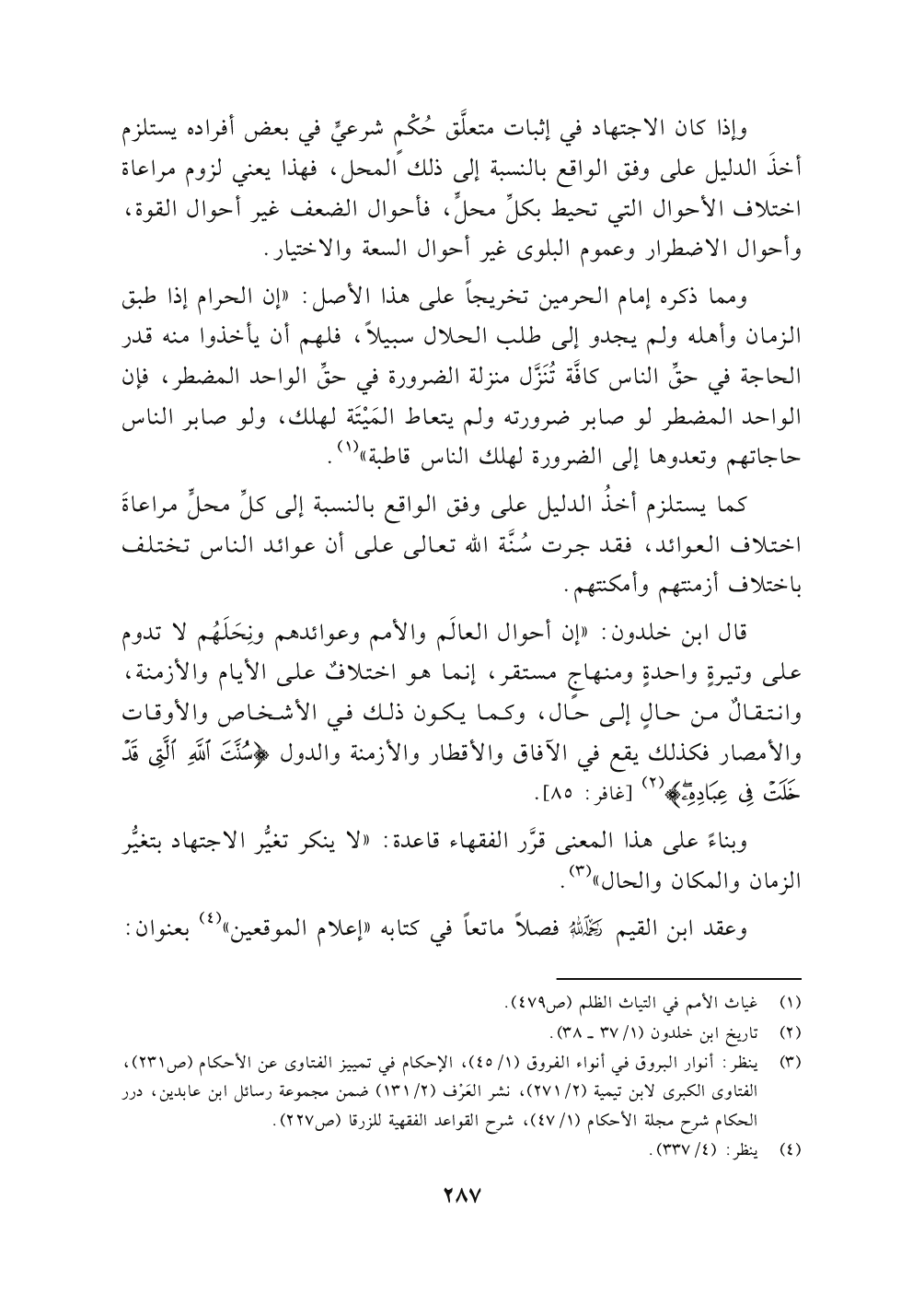 وبناءً على هذا المعنى قرَّر الفقهاء قاعدة: " لا ينكر تغيُّر الاجتهاد بتغيُّر الزمان والمكان والحال " (٤).