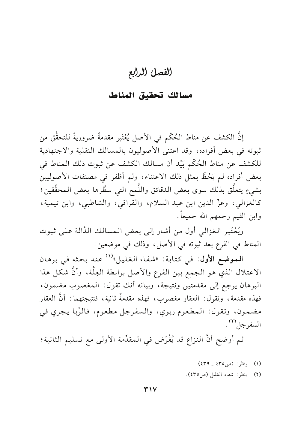 الموضع الأول: في كتابة: " شفاء الغليل " (١) عند بحثه في برهان الاعتلال الذي هو الجمع بين الفرع والأصل برابطة العِلَّة، وأنَّ شكل هذا البرهان يرجع إلى مقدمتين ونتيجة، وبيانه أنك تقول: المغصوب مضمون، فهذه مقدمة، وتقول: العقار مغصوب، فهذه مقدمةٌ ثانية، فنتيجتهما: أنَّ العقار مضمون، وتقول: المطعوم ربوي، والسفرجل مطعوم، فالرِّبا يجري في السفرجل (٢).