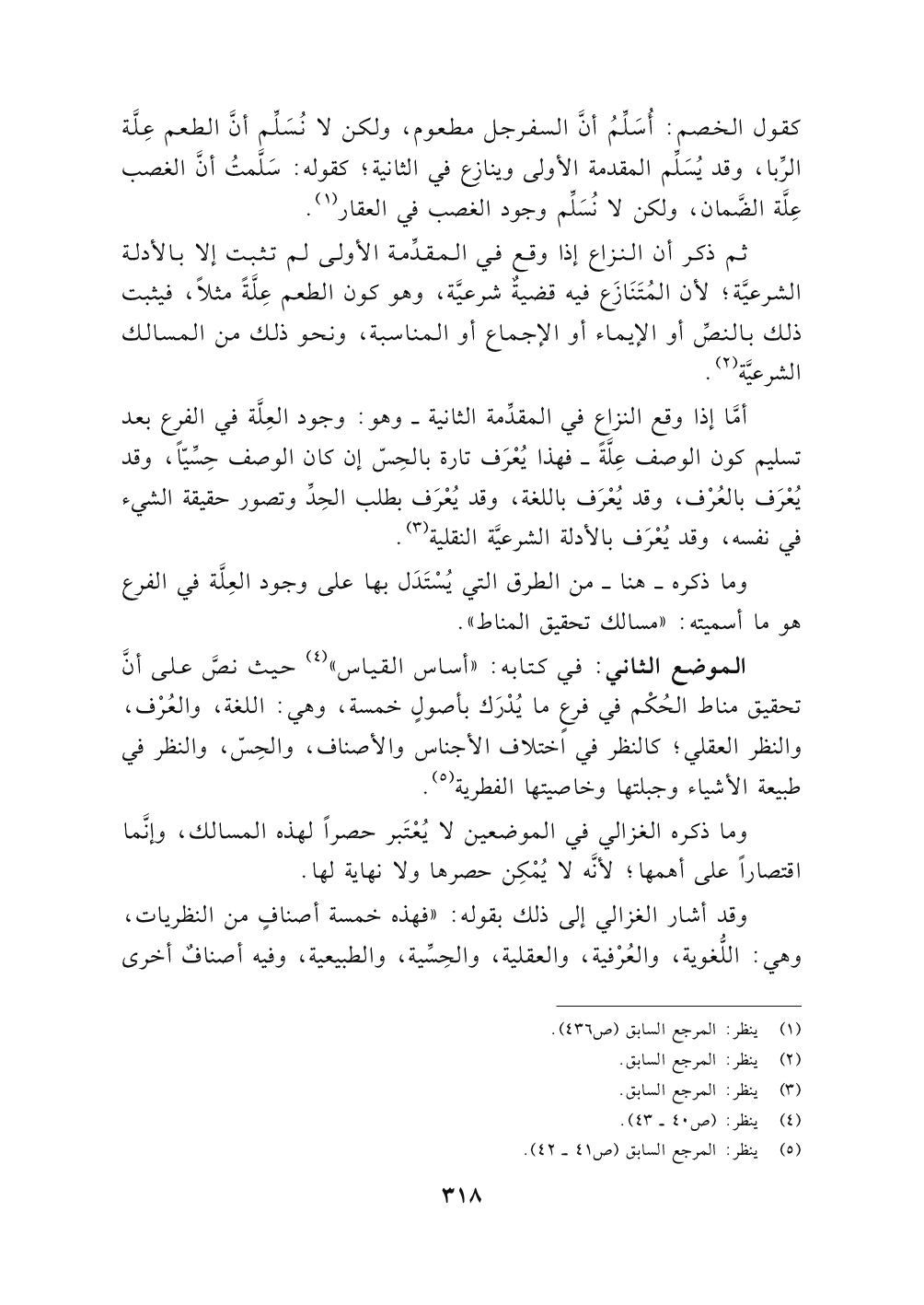 الموضع الثاني: في كتابه: " أساس القياس " (٤) حيث نصَّ على أنَّ تحقيق مناط الحُكْم في فرعٍ ما يُدْرَك بأصولٍ خمسة، وهي: اللغة، والعُرْف، والنظر العقلي، كالنظر في اختلاف الأجناس والأصناف، والحِسّ، والنظر في طبيعة الأشياء وجبلتها وخاصيتها الفطرية (٥).
