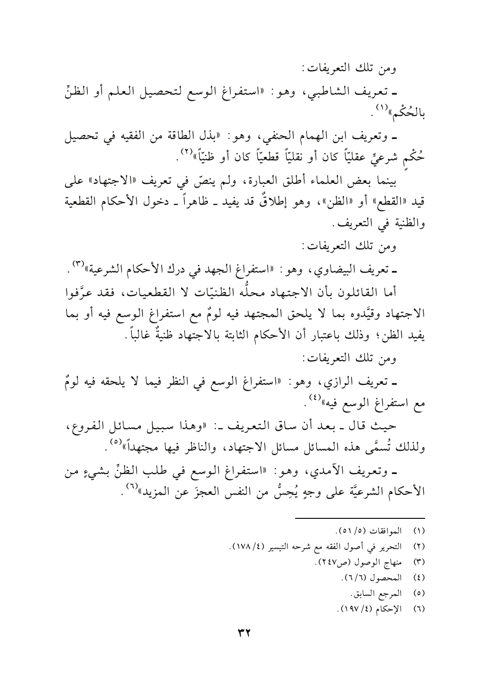 - تعريف الرازي (٧)، وهو: "استفراغ الوسع في النظر فيما لايلحقه فيه لومٌ مع استفراغ الوسع فيه" (٨).